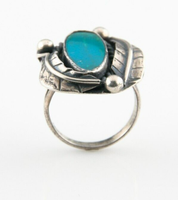 Vintage Silver Ring w/ Flush Set Turquoise (Size 7) Accented by silver Leaves