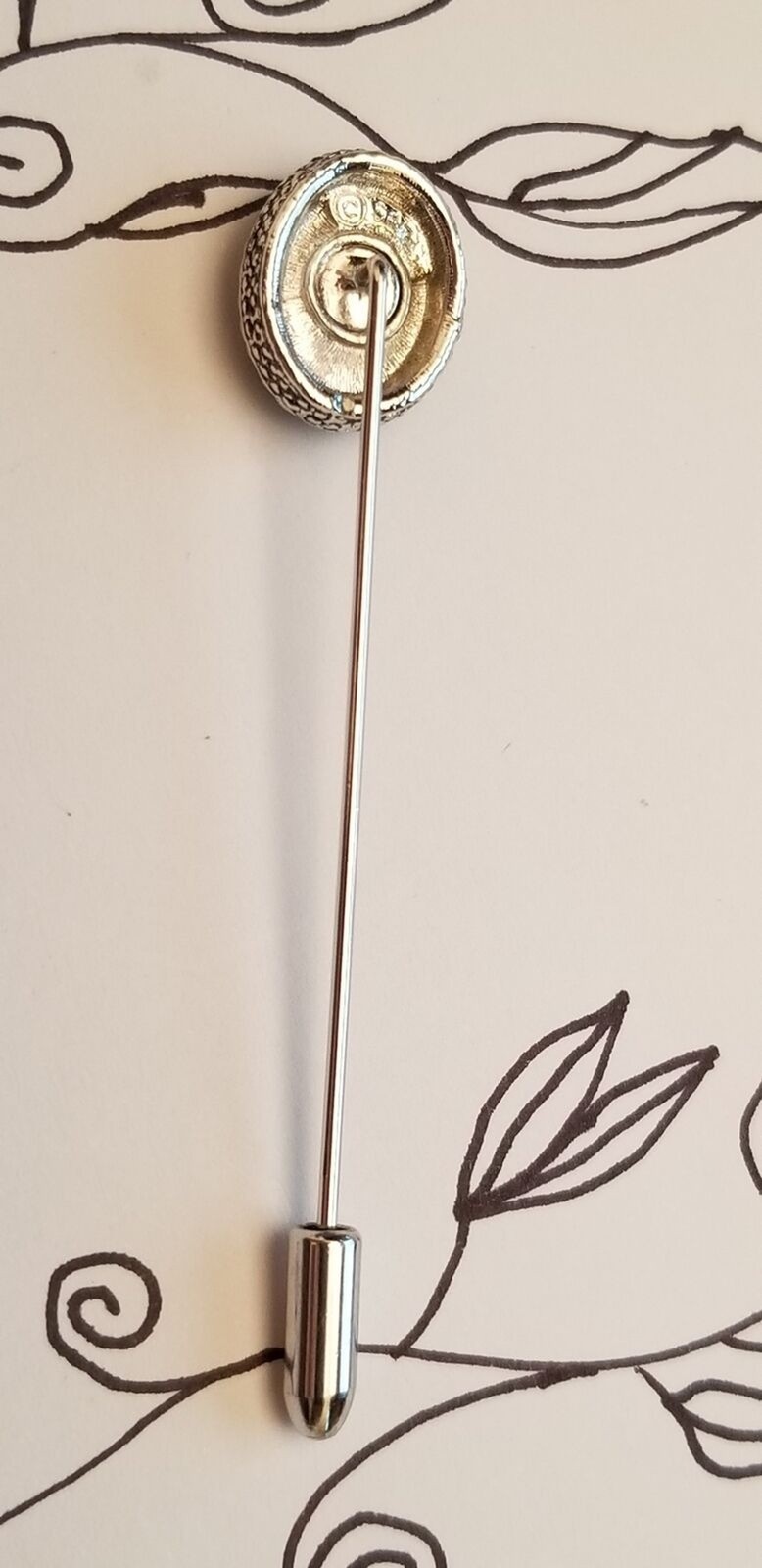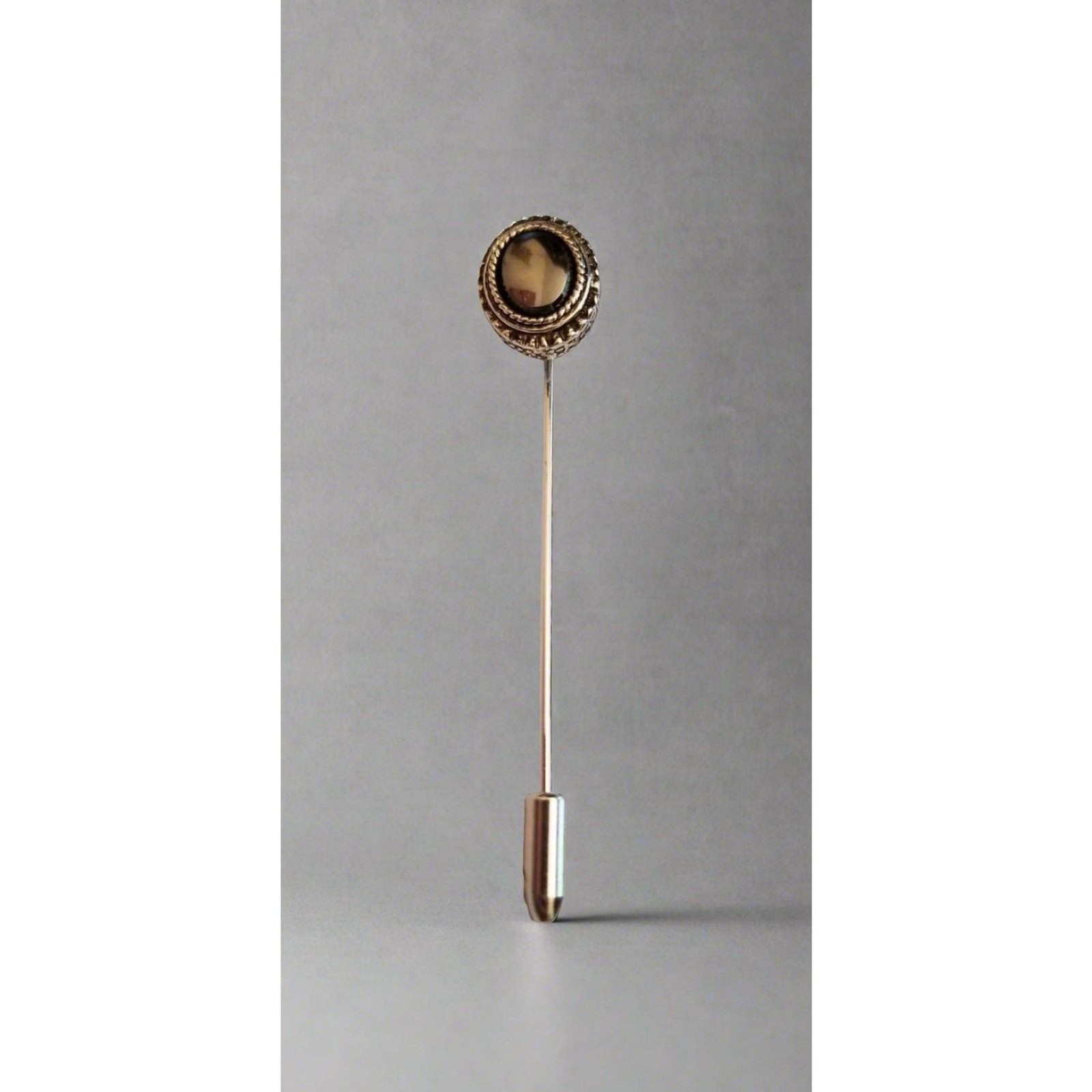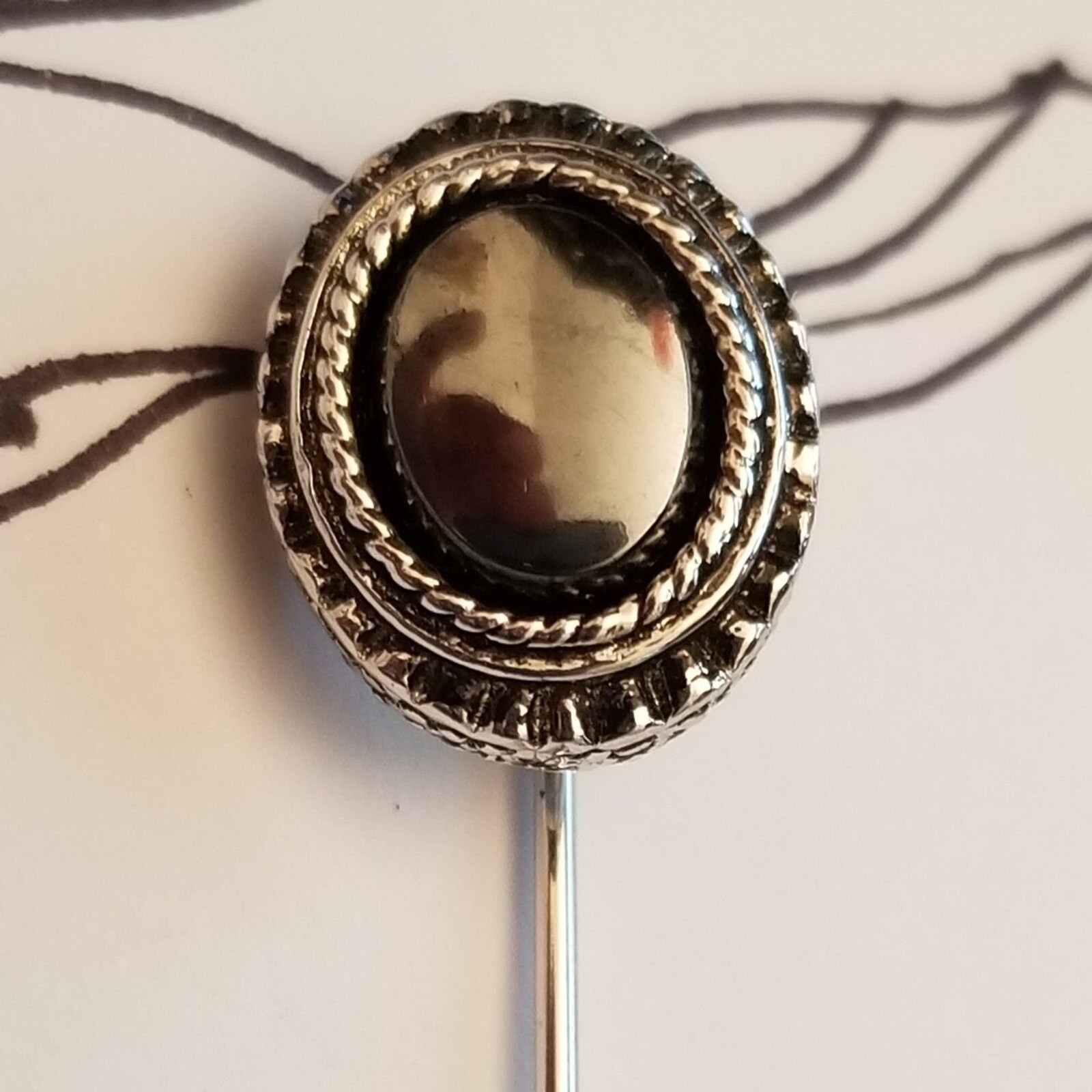 This vintage silver tone stick pin features a classic round top with a subtle textured edge, making it a timeless accessory for both men and women. Perfectly versatile, it can be worn on lapels, ties, hats, or scarves, adding a touch of understated vintage charm. A great piece for collectors or anyone who loves classic, minimalist jewelry.