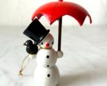 Vintage German snowman Christmas ornament. Classic wooden ornament is a snowman holding an umbrella and a blackbird and is handpainted white, black and red. Made in Germany and measures 3-1/2" high and 2-1/2" wide. It is in excellent condition.