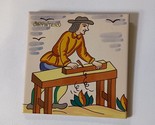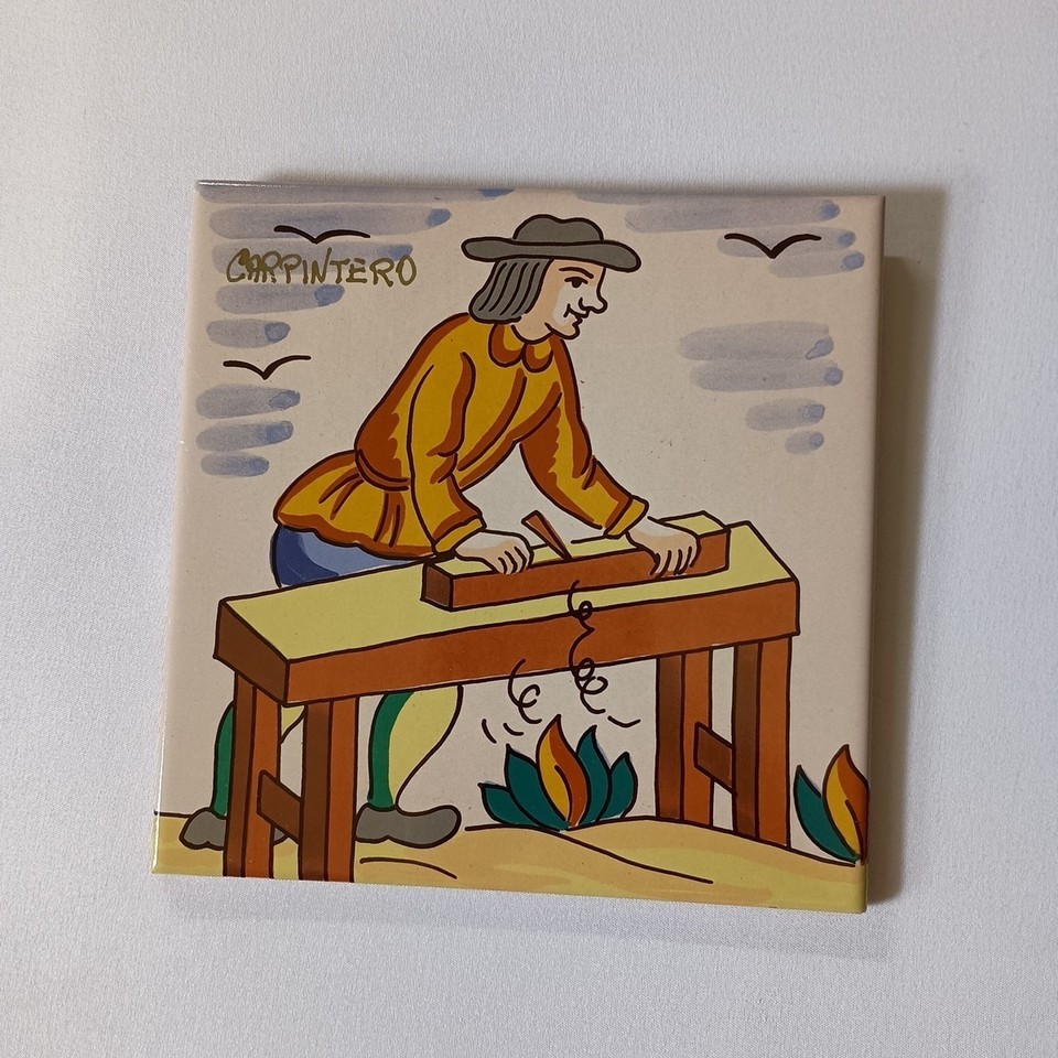 This beautiful vintage ceramic tile from Spain features hand-painted folk art craftsman carpenter design, making it a unique addition to any room. Measuring 6 inches by 6 inches and with a thickness of 1/4 inch, it is suitable for use as a kitchen counter or wall decoration.