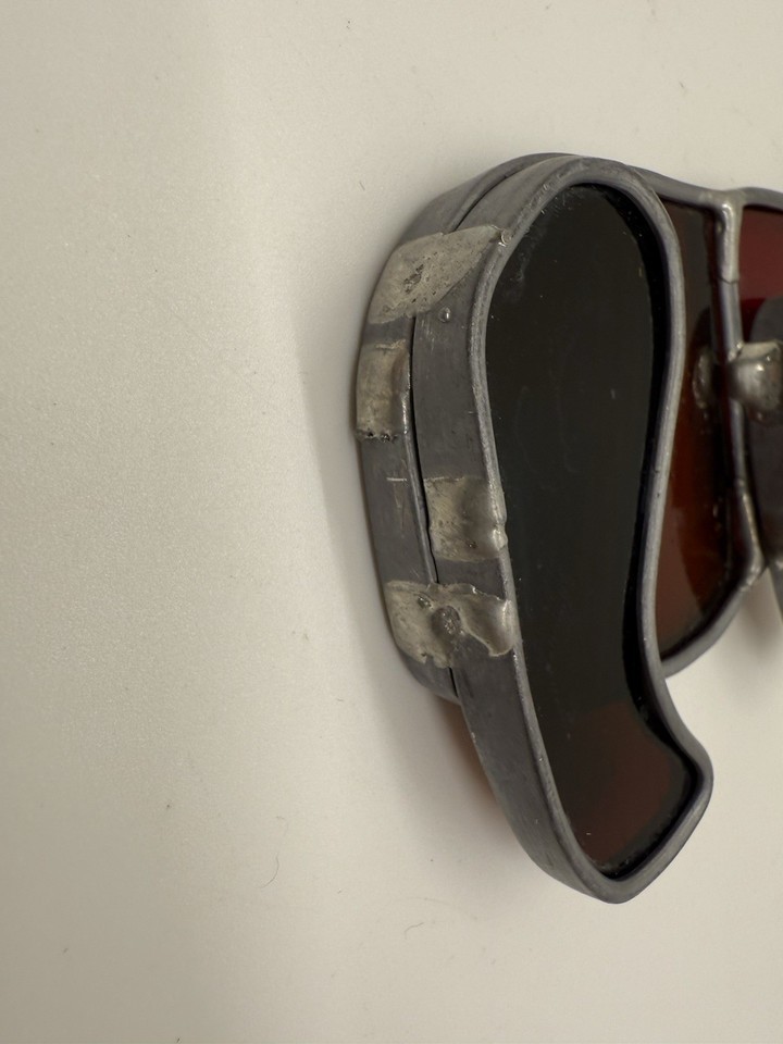 Bring a touch of warmth and handmade charm to your window with this vintage stained glass teddy bear suncatcher. Crafted in the Tiffany-style copper foil method, the bear features amber, ruby red, and dark brown glass sections soldered in silver-tone metal, giving it a nostalgic folk art feel.