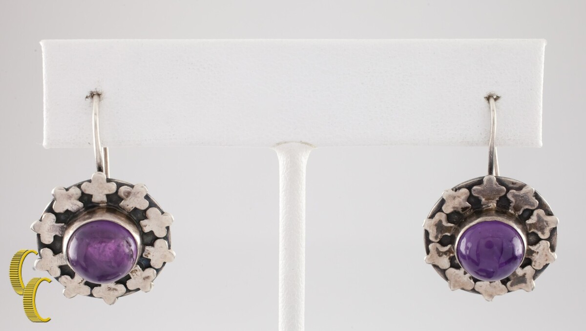 Vintage Sterling Silver Amethyst Cabochon Dangle Earrings with Hook Backs
