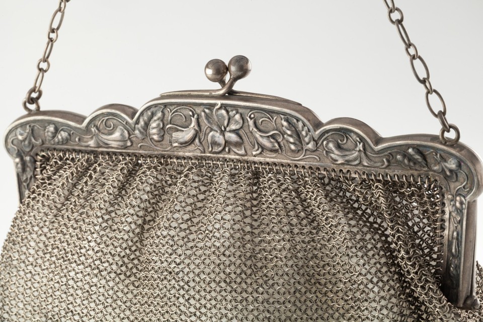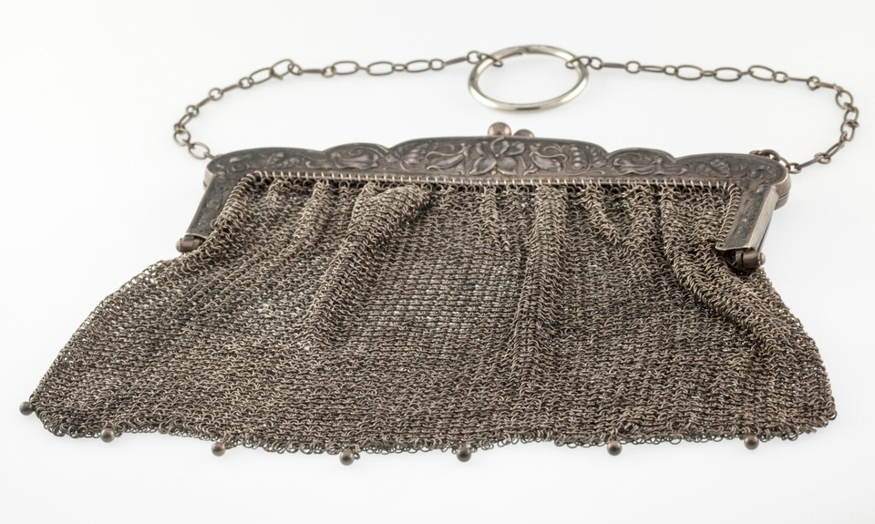 - Vintage Sterling Silver Mesh Purse With Flora Pattern on Clasp and Chain Handle