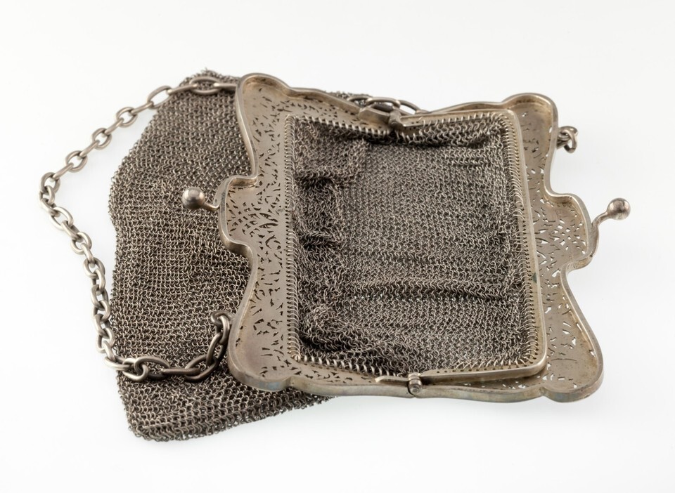 - Vintage Sterling Silver Mesh Purse w/ Chain Handle and Cutout Design Frame