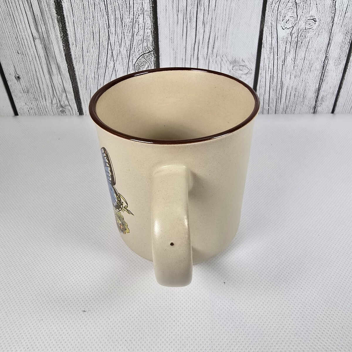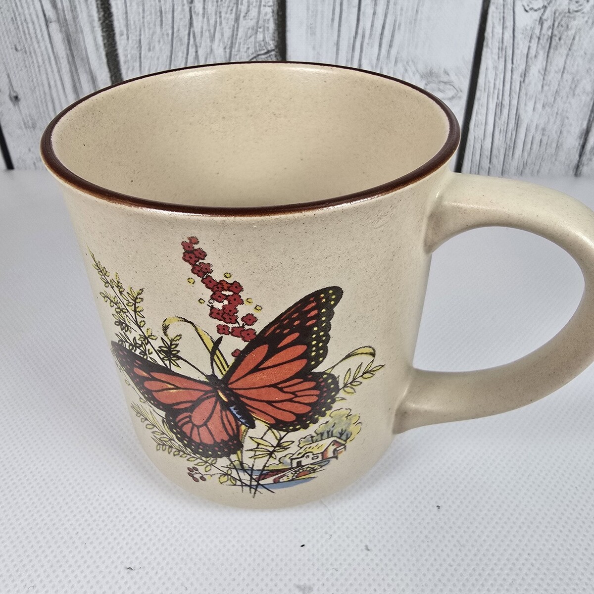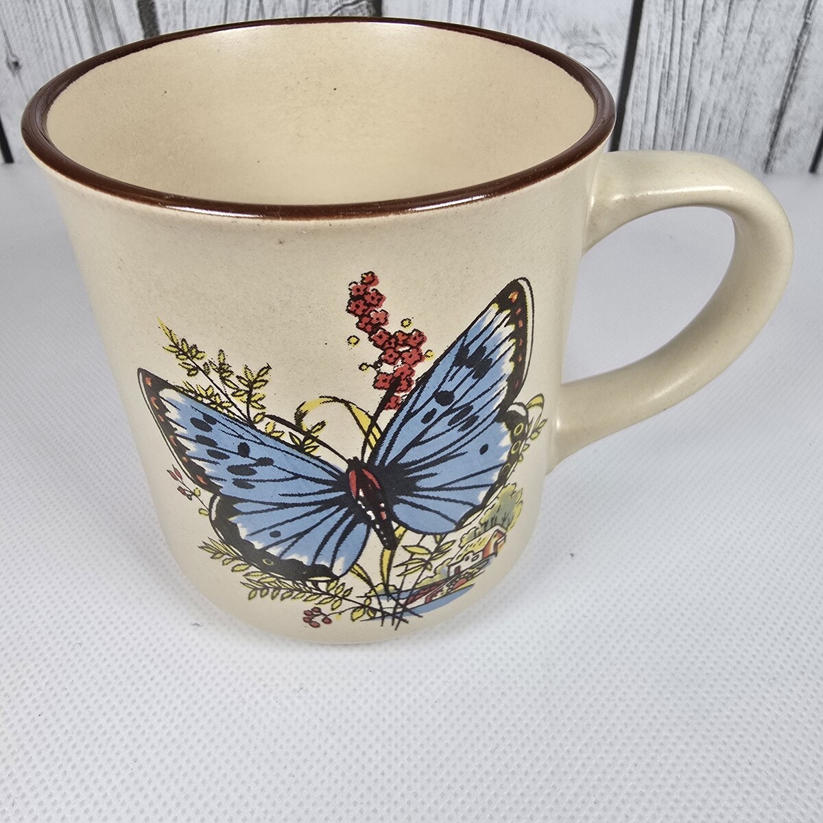 These charming vintage stoneware mugs feature a whimsical blue and orange butterfly motif with a warm brown rim, perfect for collectors or everyday use. Each mug holds approximately 12?oz and is a versatile decor piece or functional tabletop favorite.