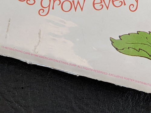 Wisdom from Strawberry Shortcake: "A little tender loving care makes happiness grow everywhere!" Original 1980s print/poster in its original cardboard. Print measures about 8" x 10" Bottom right text (hard to read due to the frame edge covering most of it}: 13-483 SS/Loving Care c 1980 American Greetings Corp...Exclusive Poster Distributor Pro-Arts Inc Medina Ohio USA.
