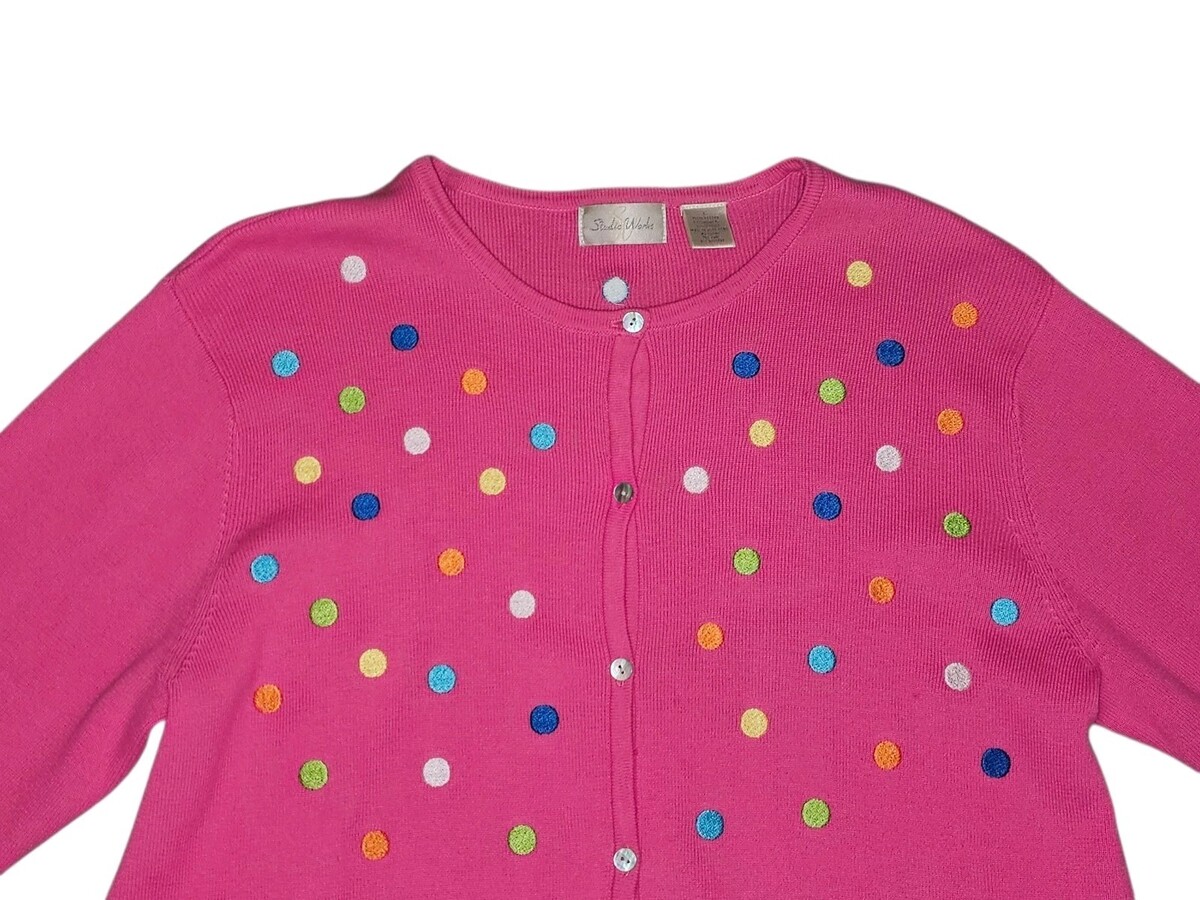 - Vintage Studio Works Pink Polka Dot Cardigan Button-Up Cotton Sweater Sz L