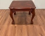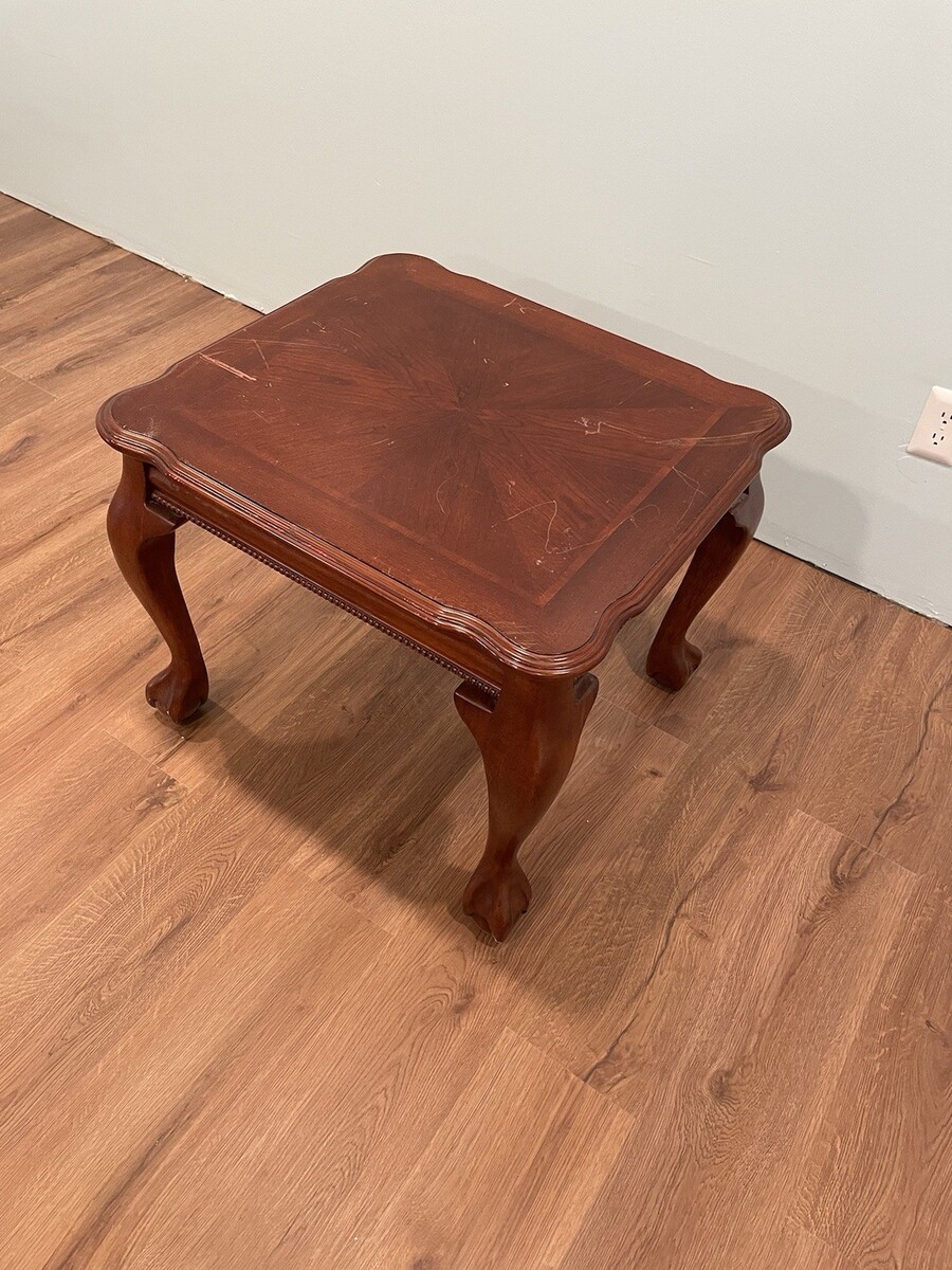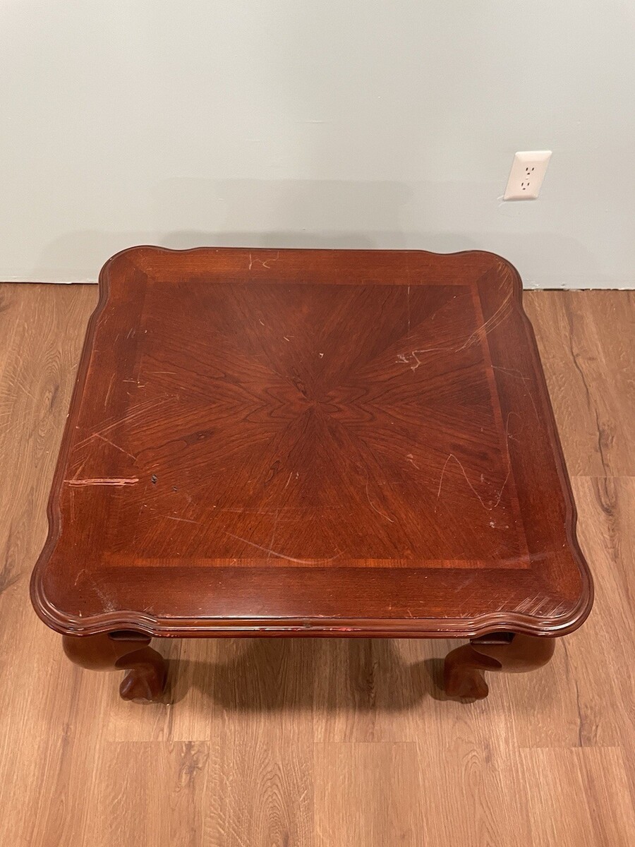 For sale is a newer vintage style wood end table with ball and claw feet. It has some scratches as shown. Very solid construction.