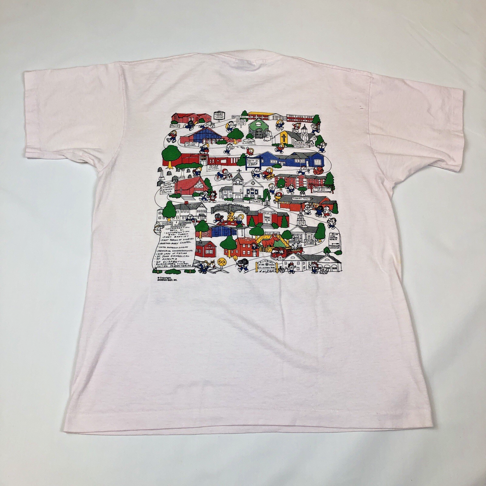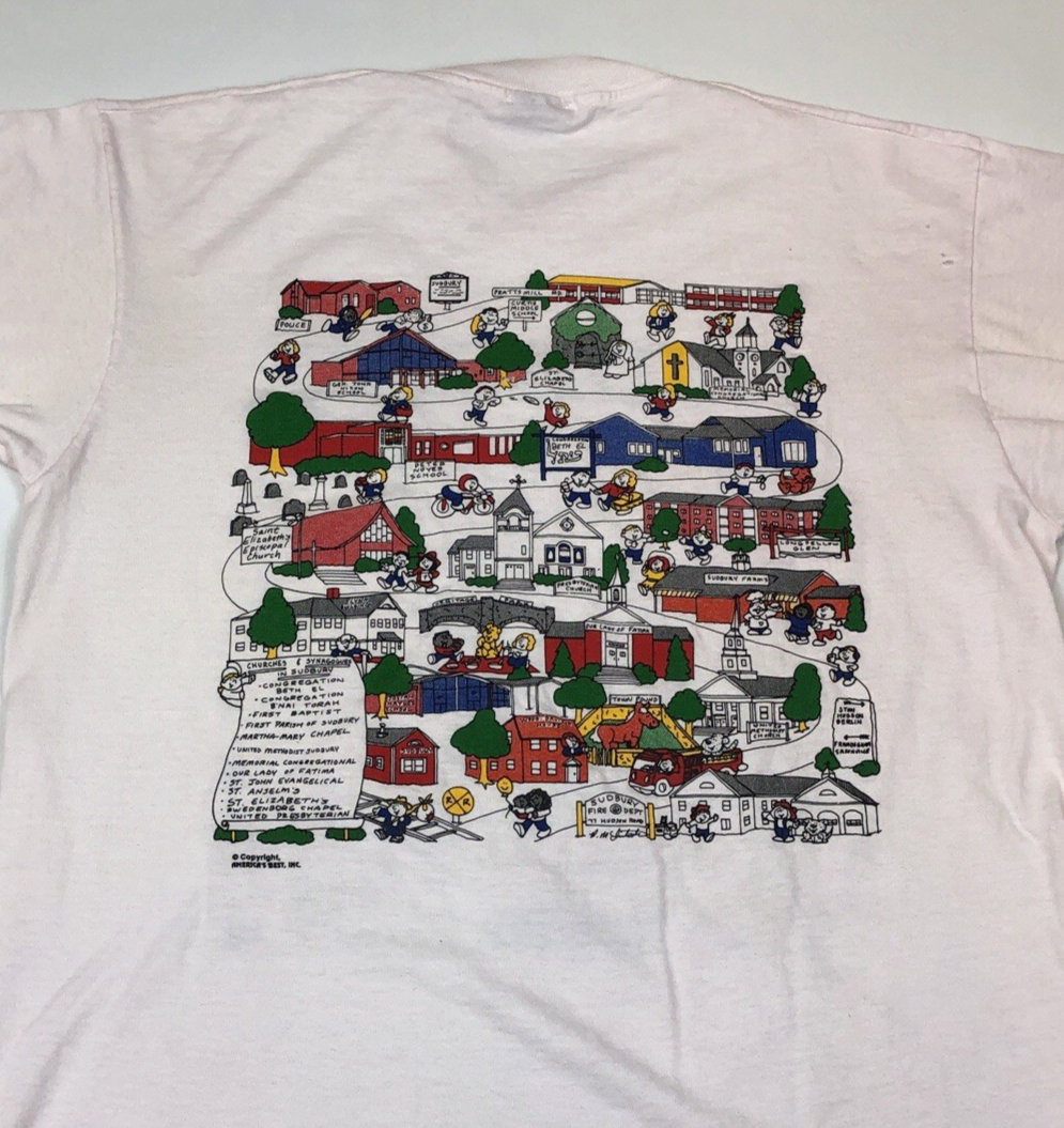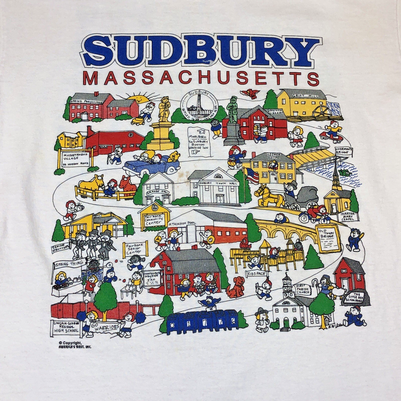 Vintage Sudbury Massachusetts Cartoon Town White Double Sided T-Shirt