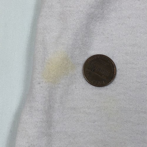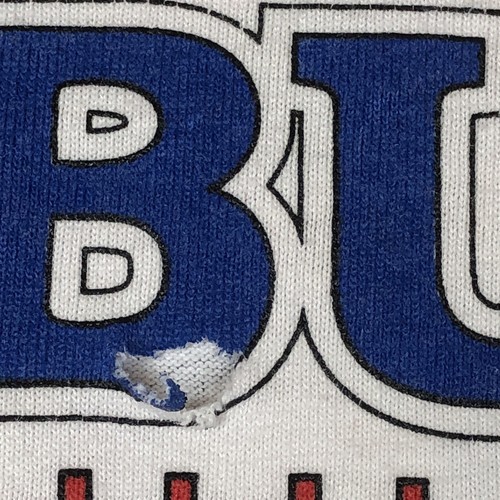 Shirt has a a hole on the letter B on the front and a couple holes on the back right shoulder. See photo