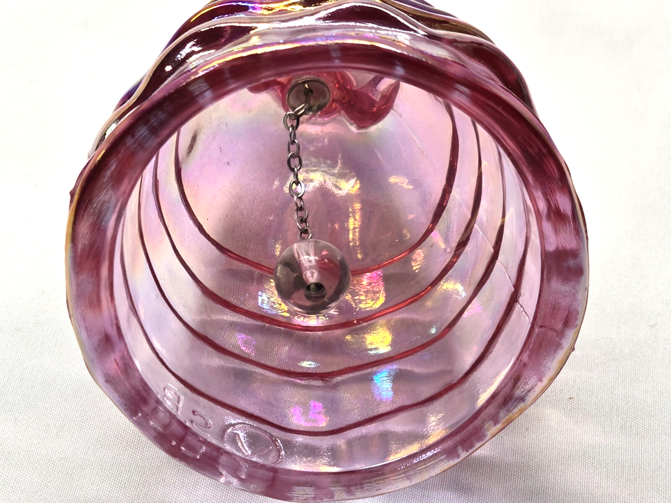 Beautiful Melanie Southern Belle figurine by Summit Art Glass. Bell is in excellent condition, has great color and no wear or damage. Measures 5" and is 2.75" in diameter at the base. I don't know the exact pattern name or if it even has one, but the color is sort of a pink iridescent carnival style glass.