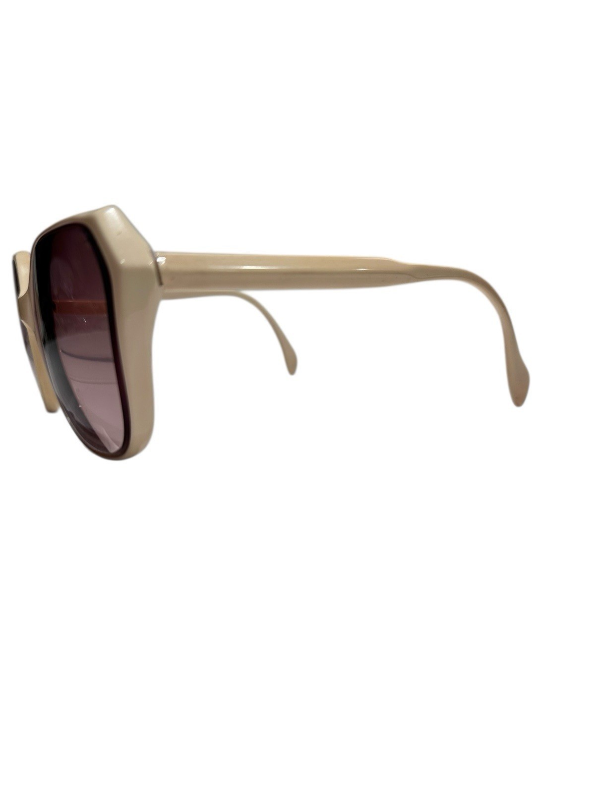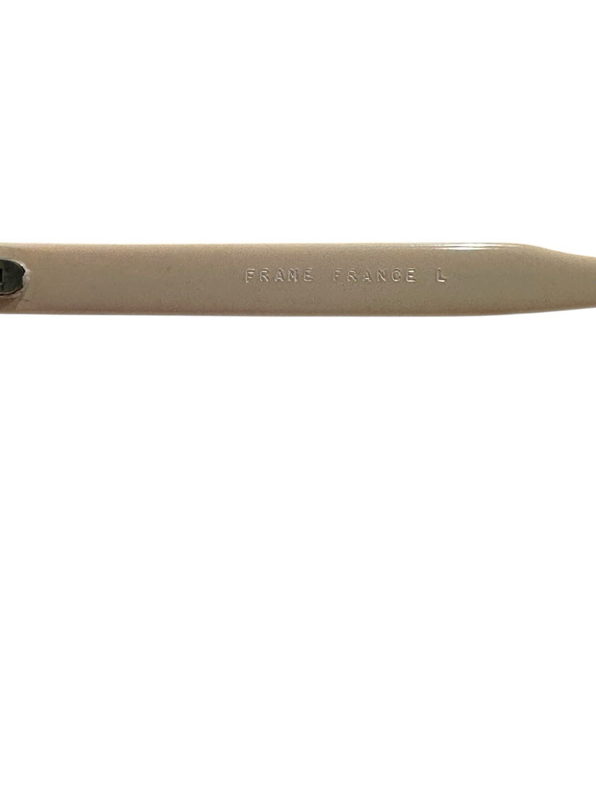This is a stylish pair of vintage sunglasses, marked "Frame France," indicating they were made in France during the 1970s or early 1980s. The oversized, light-colored frames have a subtle geometric shape, perfectly capturing the bold, glamorous look of the era. The lenses have a brown gradient tint, which is classic for vintage sunglasses.