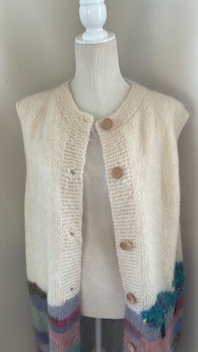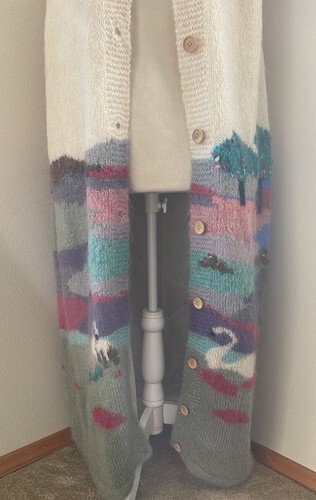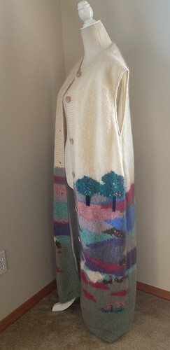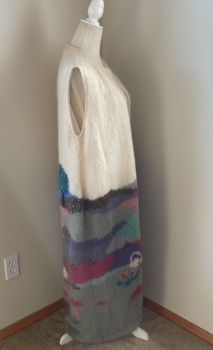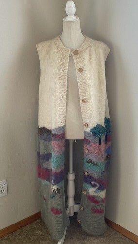 Vintage Susan Vale Full Length Hand Knitted Sweater Cardigan Duster Mohair Pockets Lined Sleeveless Wooden Buttons Grandmacore Swans Trees Excellent Condition One Size Made in England