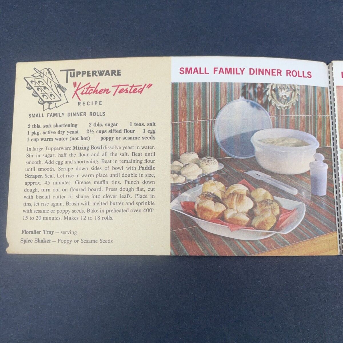 Vintage Tupperware ?Kitchen Tested? Recipes fold-out pamphlet featuring classic mid-century recipes designed for Tupperware products. A collectible piece of Tupperware history, perfect for retro kitchen enthusiasts, recipe collectors, and vintage advertising fans.