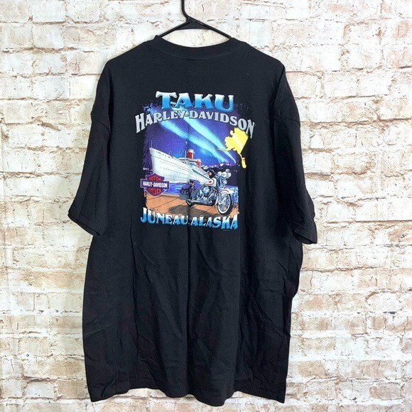 Vintage Taku Harley Davidson Bar Shield Juneau Alaska T-shirt Size XXL NEW - Cotton / black with bar and shield logo and dealership logo on back. 1999 new without tags never worn