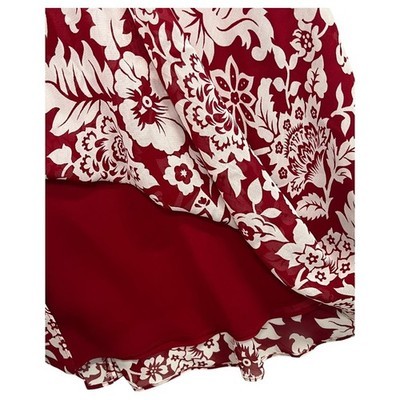 V-neckline with allover ivory/white floral print on a rich red background
