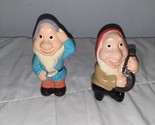 Vintage Thailand Happy Bashful Seven Dwarfs Ceramic Figures. Bashful is approximately 6 inches tall. Happy is approximately 5 inches tall. The label on the bottom of the figures is in Japanese.