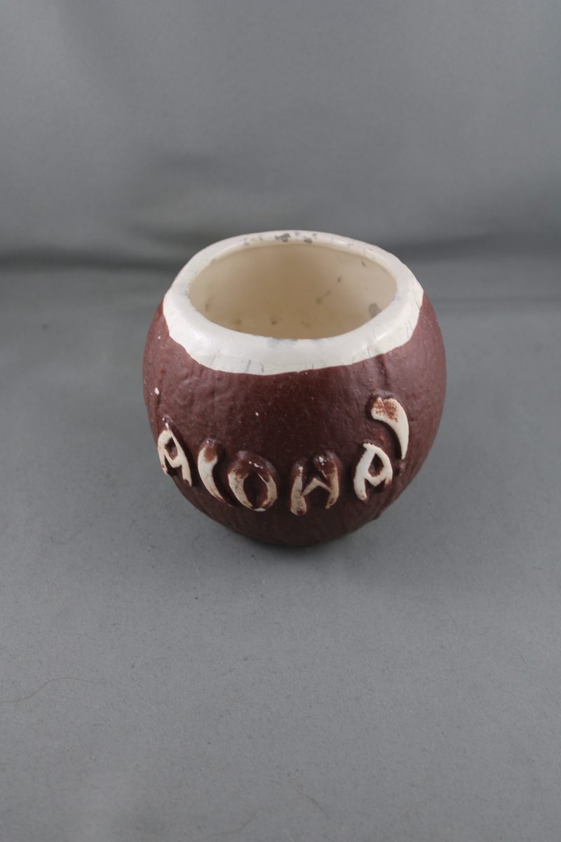 Up for sale is a vintage tiki muig. It is a Trader's Vic mug with a white outside and a brown hand painted outside. The mug is styled to look like an open coconut with Trader Vic's on the front and Aloha on the back. What a great mug do not miss out on it.