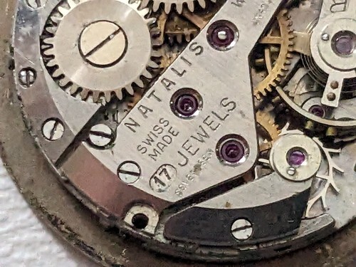 Zum Verkauf steht ein Vintage Tilius Natalis Swiss 17 Jewel Uhrwerk zur Reparatur und für Ersatzteile.