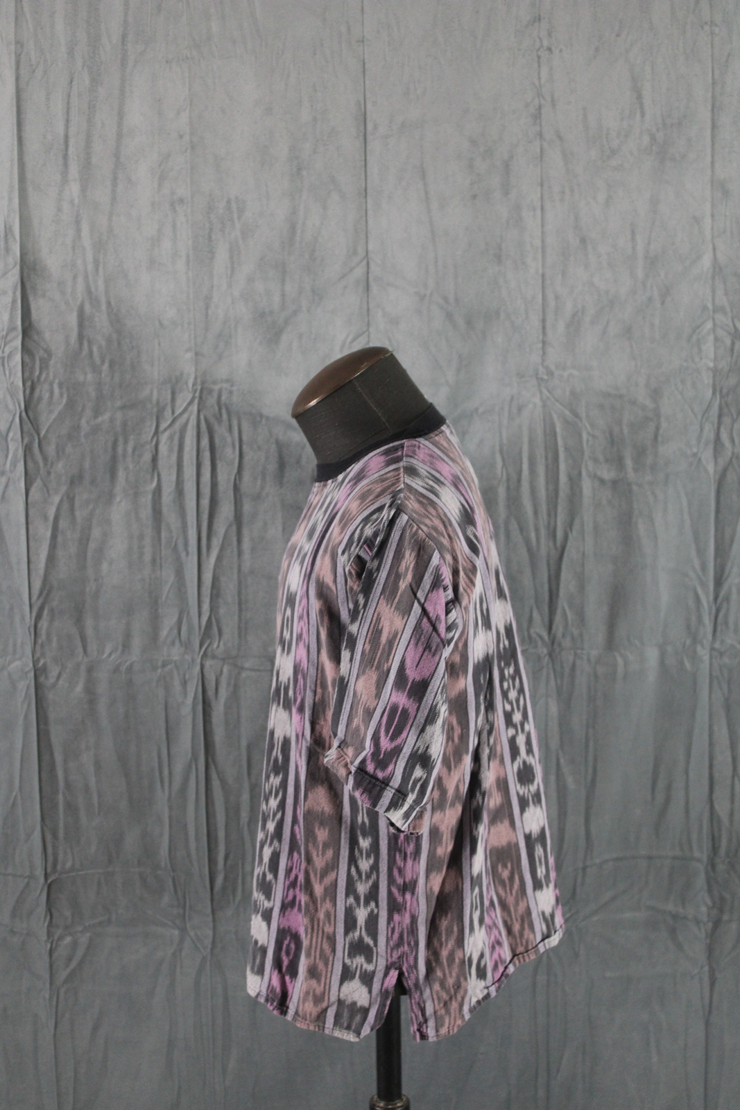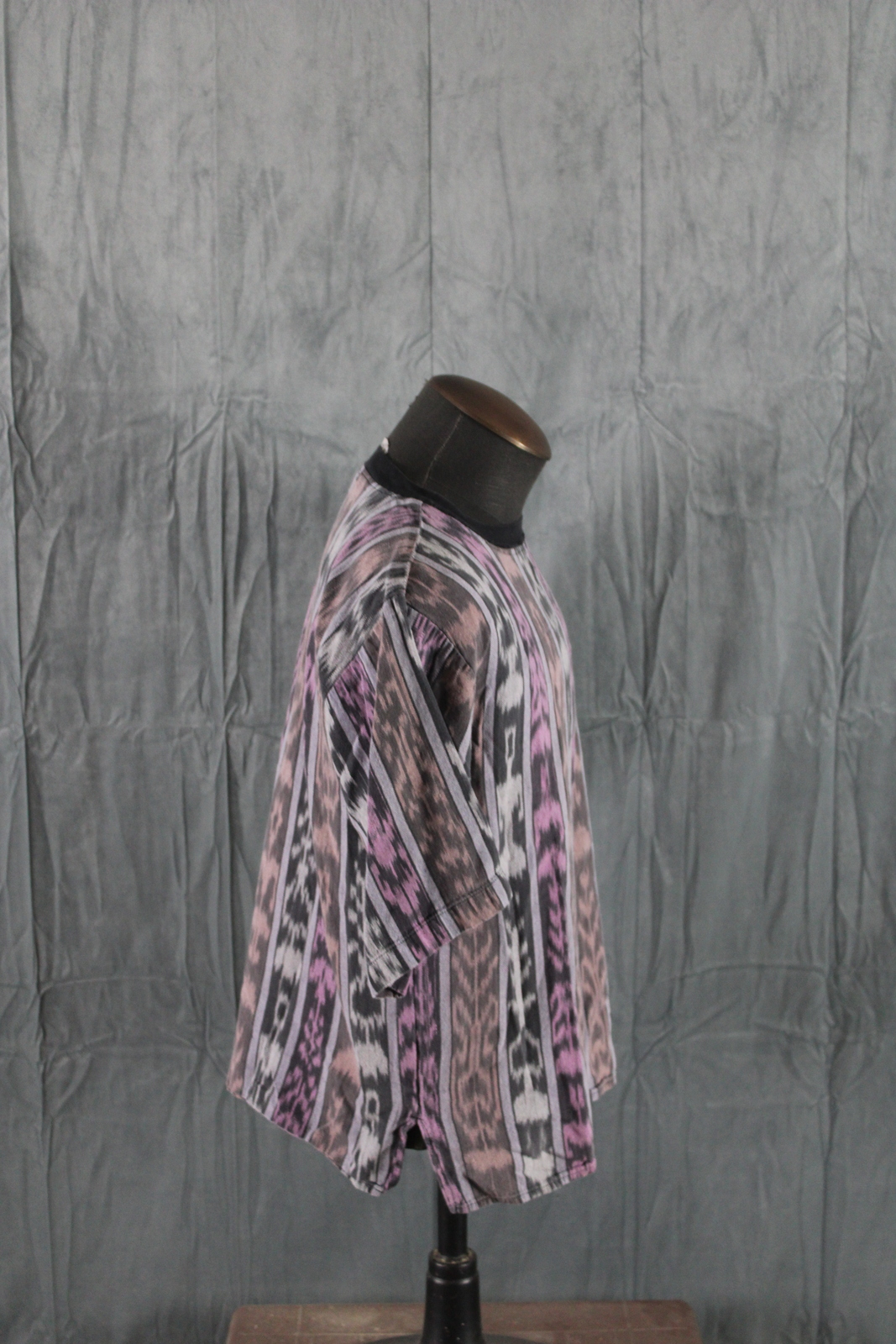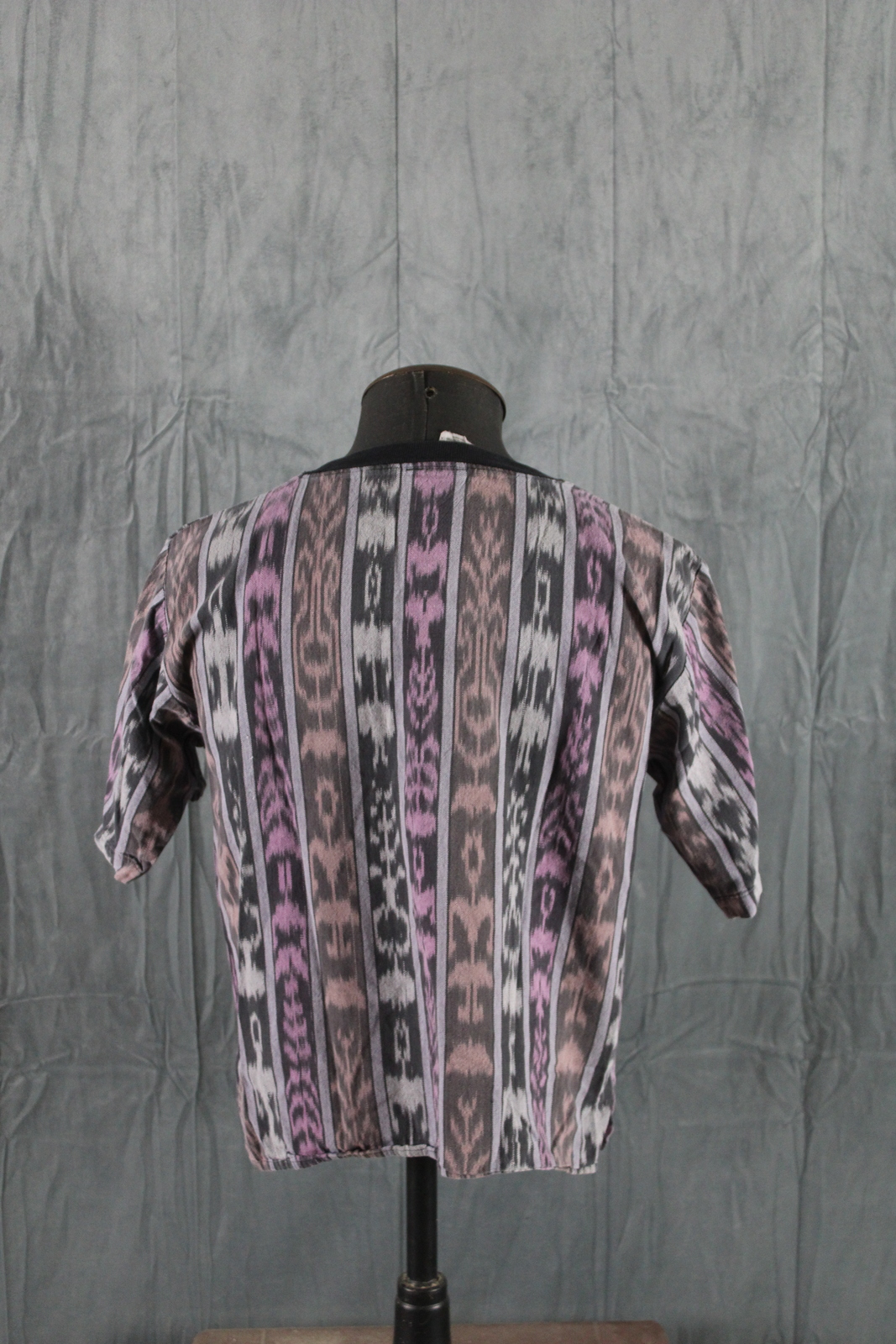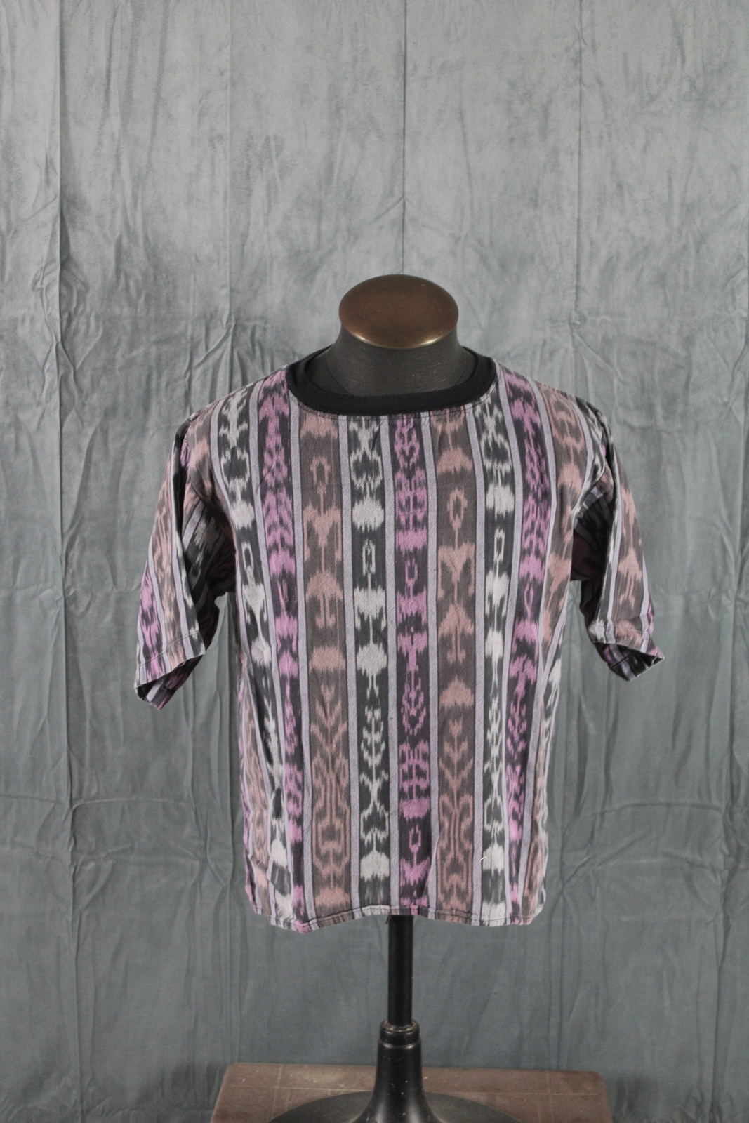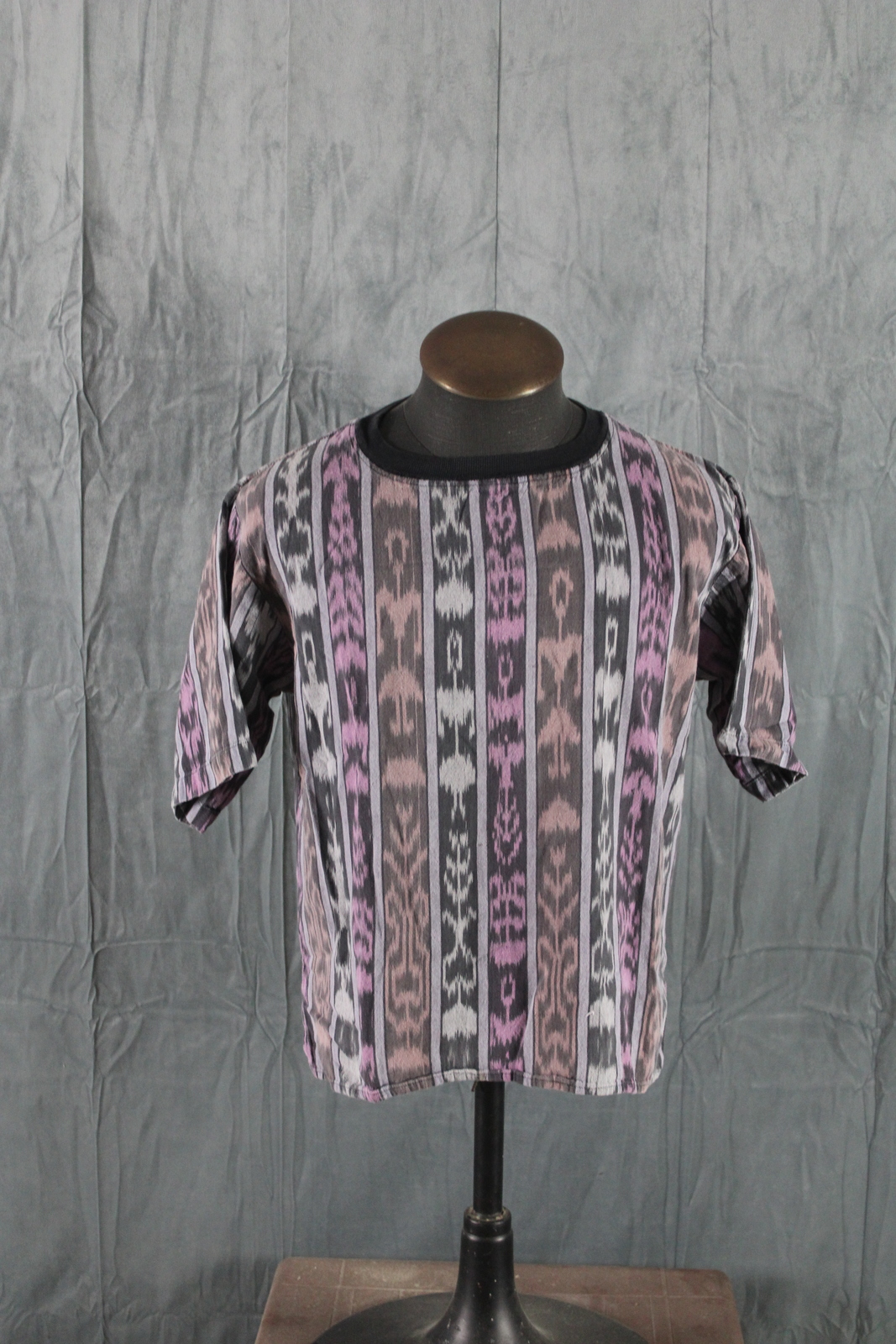 Up for sale is a vintage tribal t-shirt by Kokopelli. It has black trim with vertical tribal patterns sittiched in purple, green and orange. What a great shirt do not miss out on it.