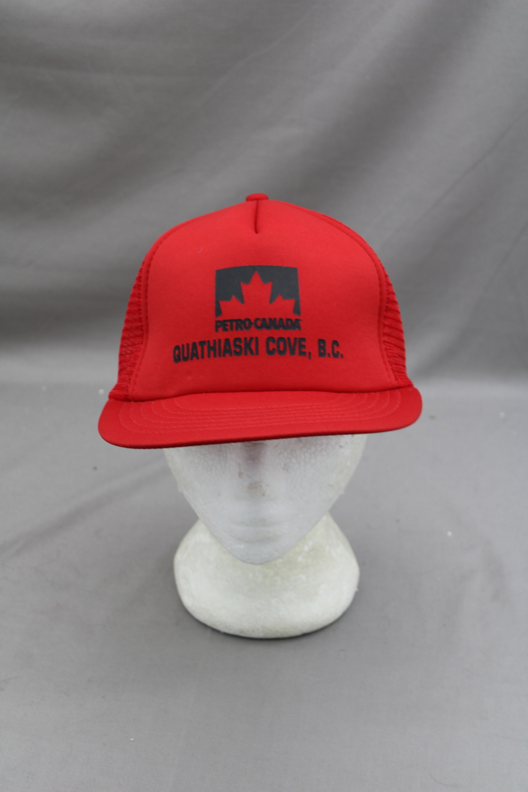 Up for sale is a vintage screened trucker hat. It has a red base colour with the Petro Canada logo and Quathiaski Cove BC screened on in black. What a great hat do not miss out on it.