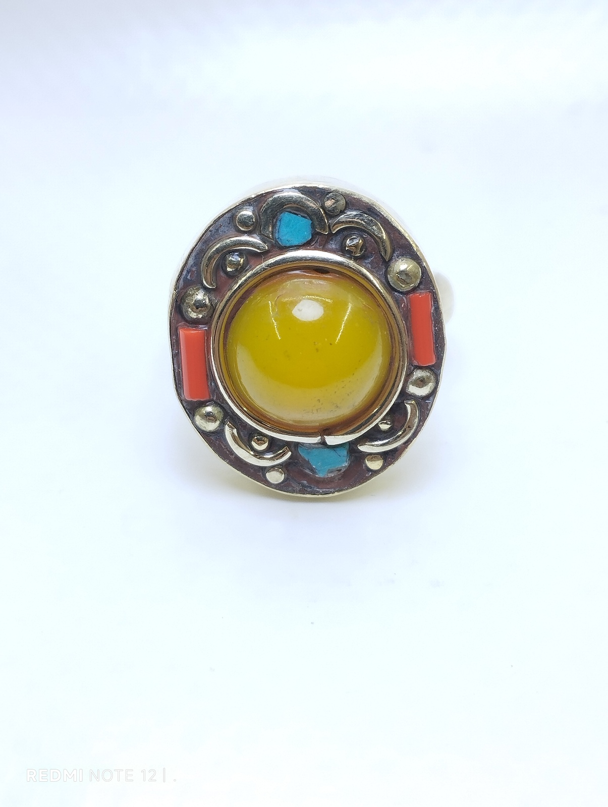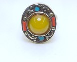 The centerpiece features a yellow resin stone accented with small coral and turquoise inlays, giving it a unique ethnic charm.