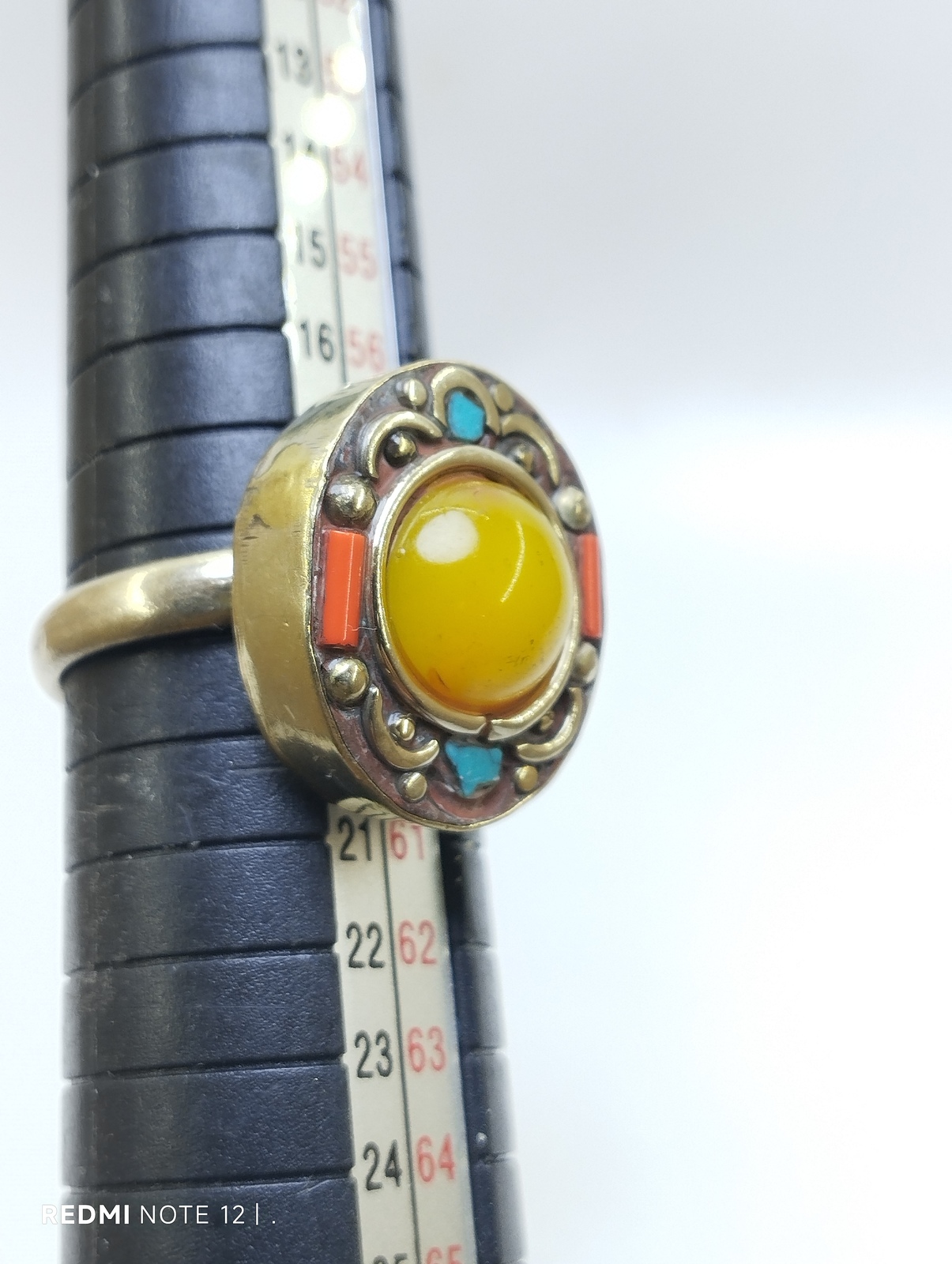- Vintage Tuareg Style Brass Ring with Yellow Resin Stone and Coral Inlay