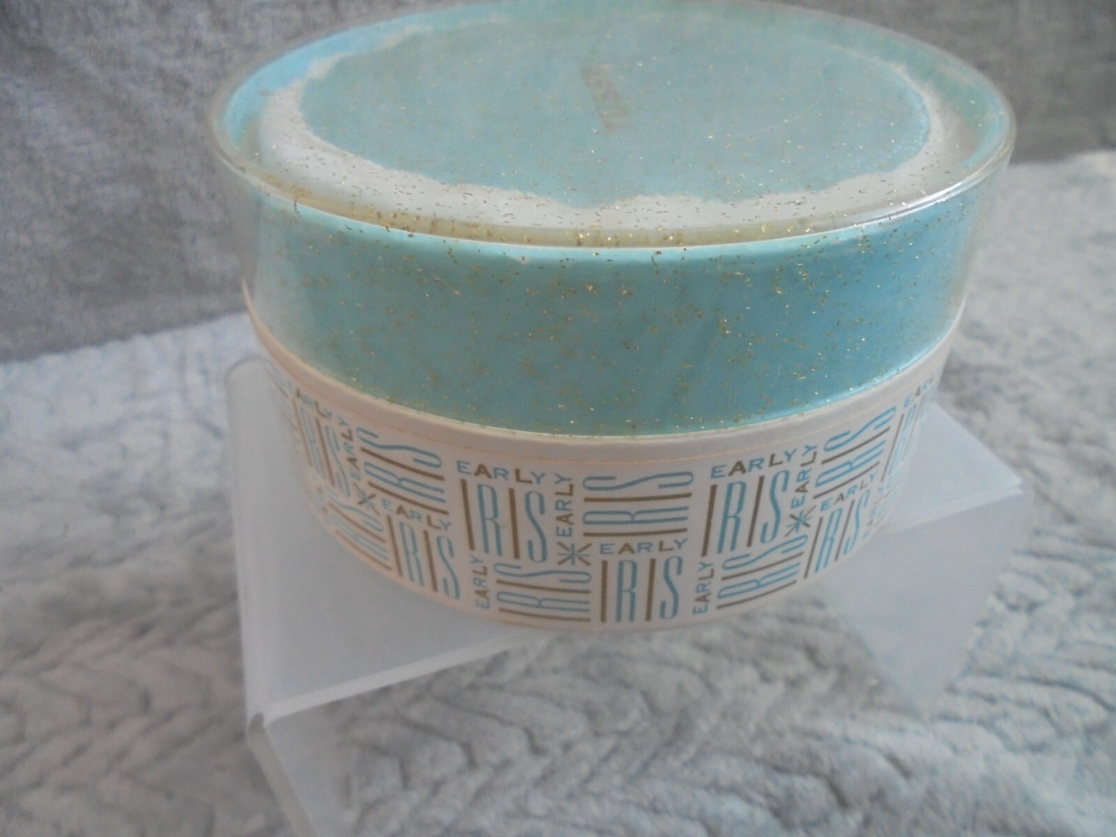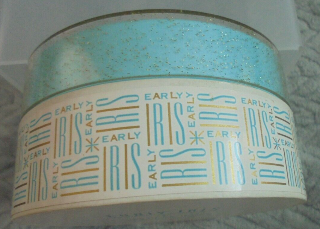 Description: Tussy Cosmetics New York Paris vintage dusting/bath powder in pretty round box. Sparkly lid and "Early Iris" in retro lettering.