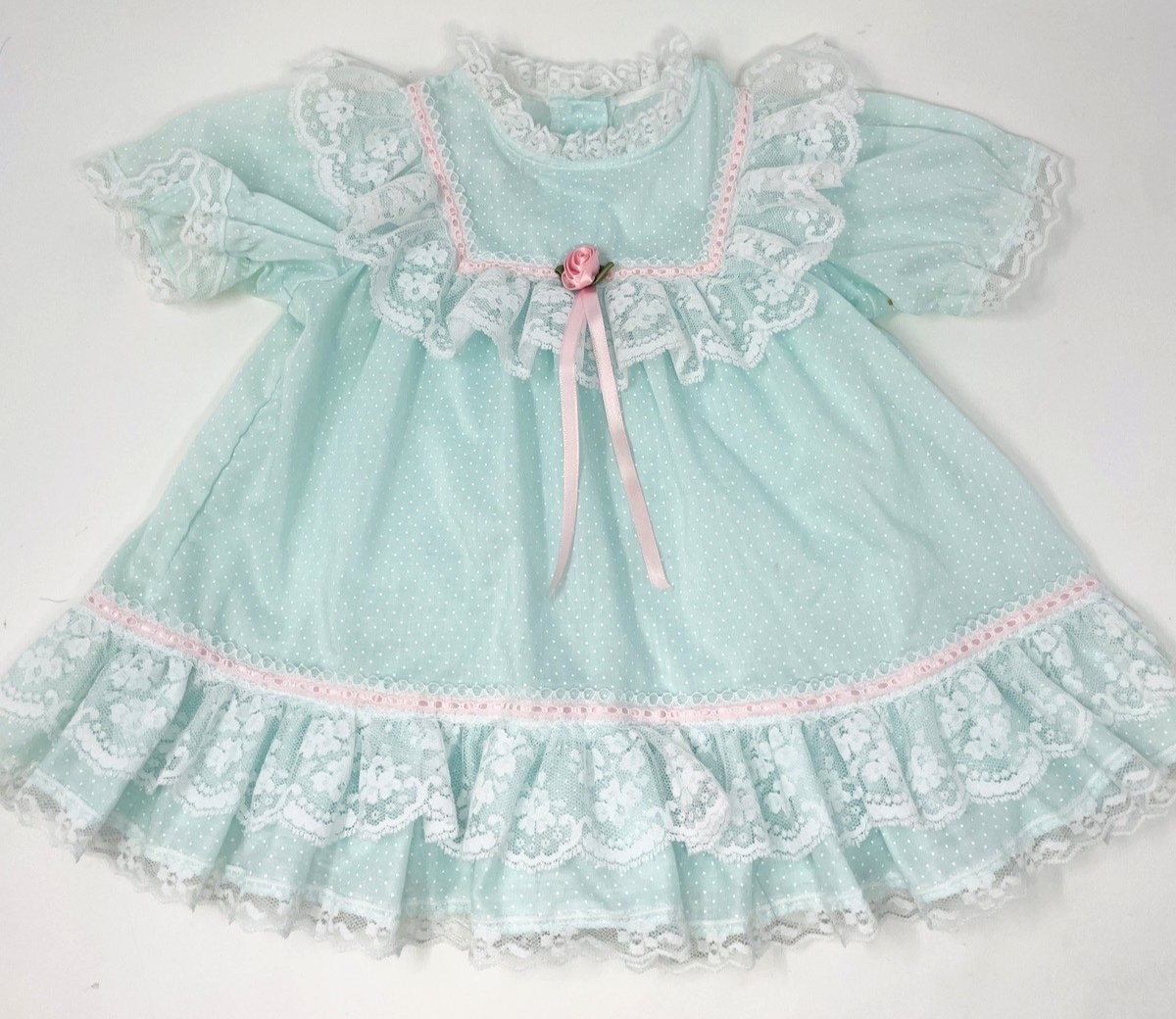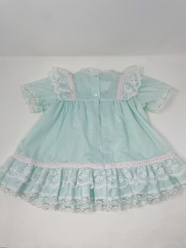 - Vintage USA Made Girls Smocked Baby Girl Dress 18 Months Teal Blue Lace Ruffles