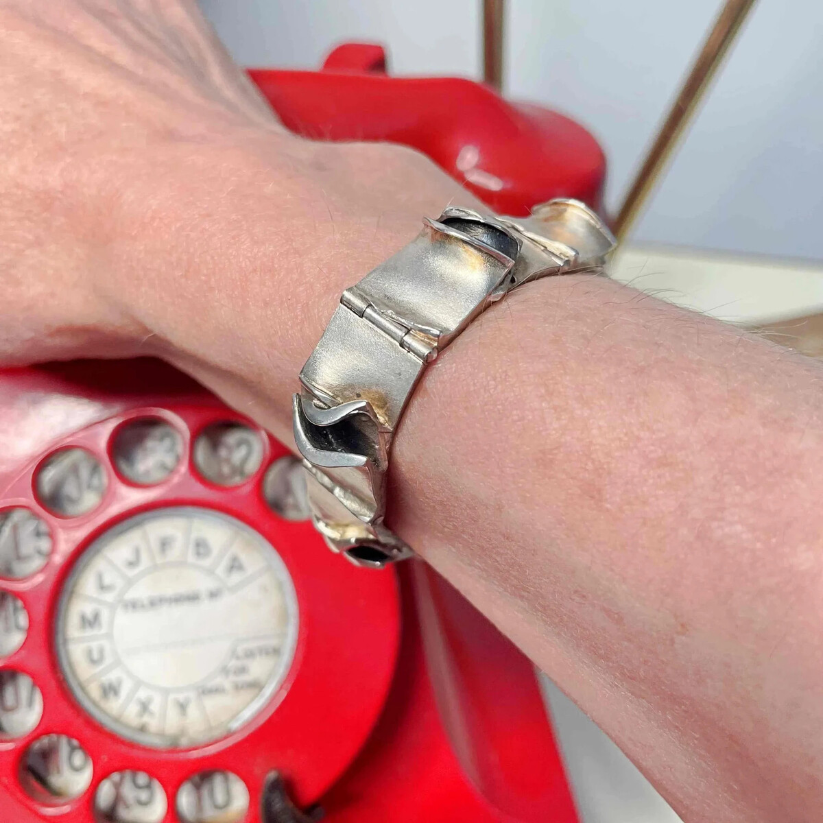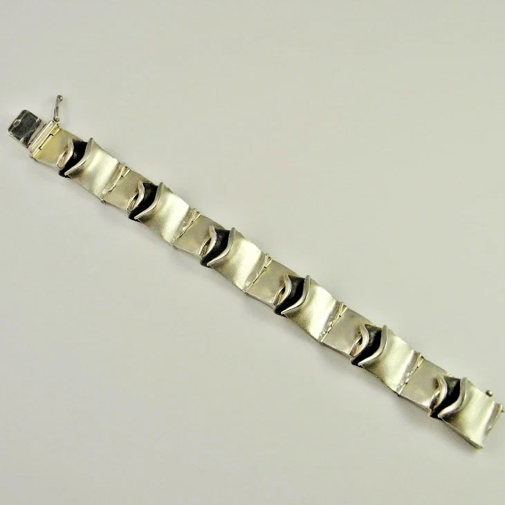 There is lovely patina to the bracelet with a satin silk like finish to the fine sterling silver and lovely oxidation to the central section of each link. The satin like finish of the silver catches the light beautifully.