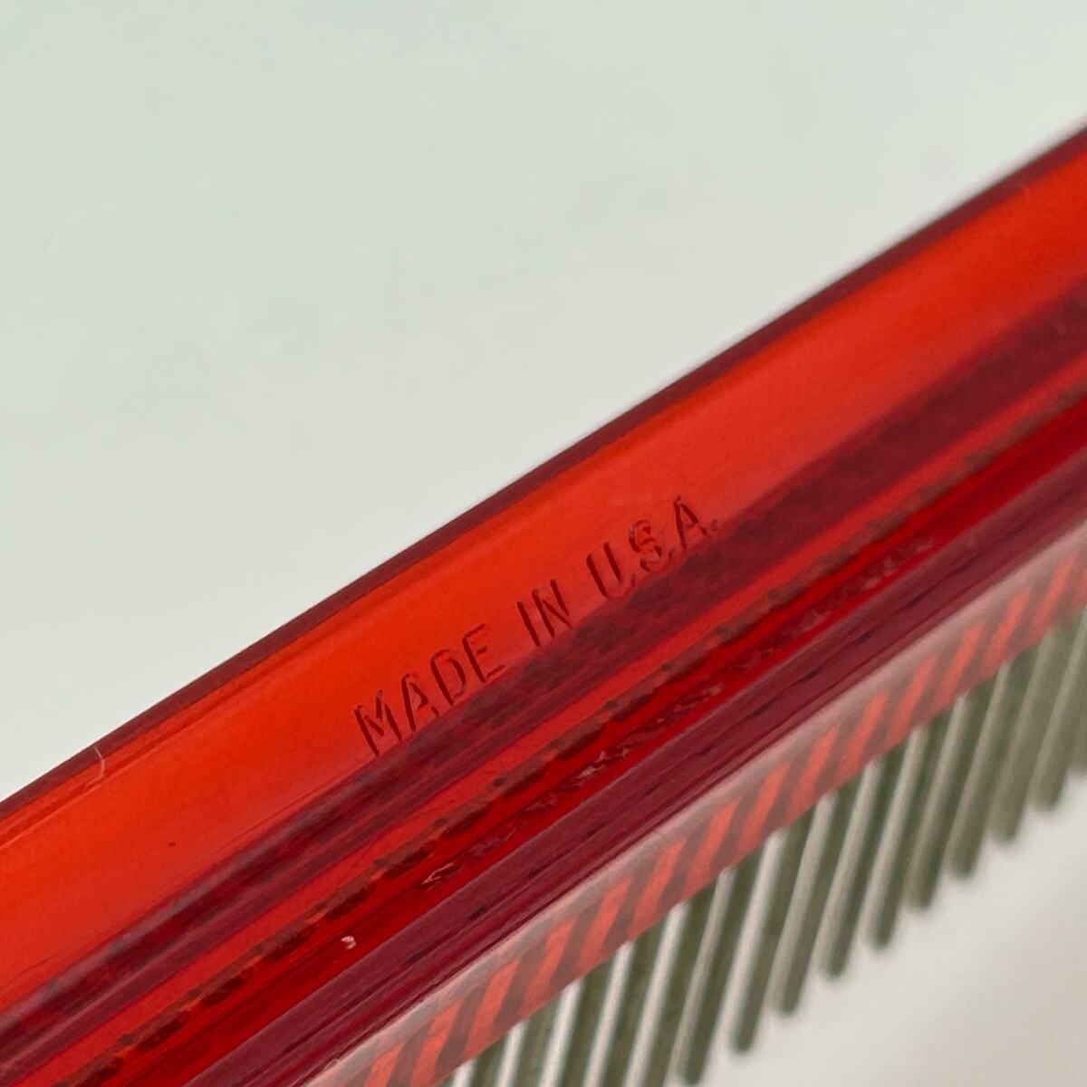 Vintage Untangler circledR; Detangling Comb, made in the USA. Features a translucent red plastic base and sturdy metal rotating pins that glide through hair without pulling.