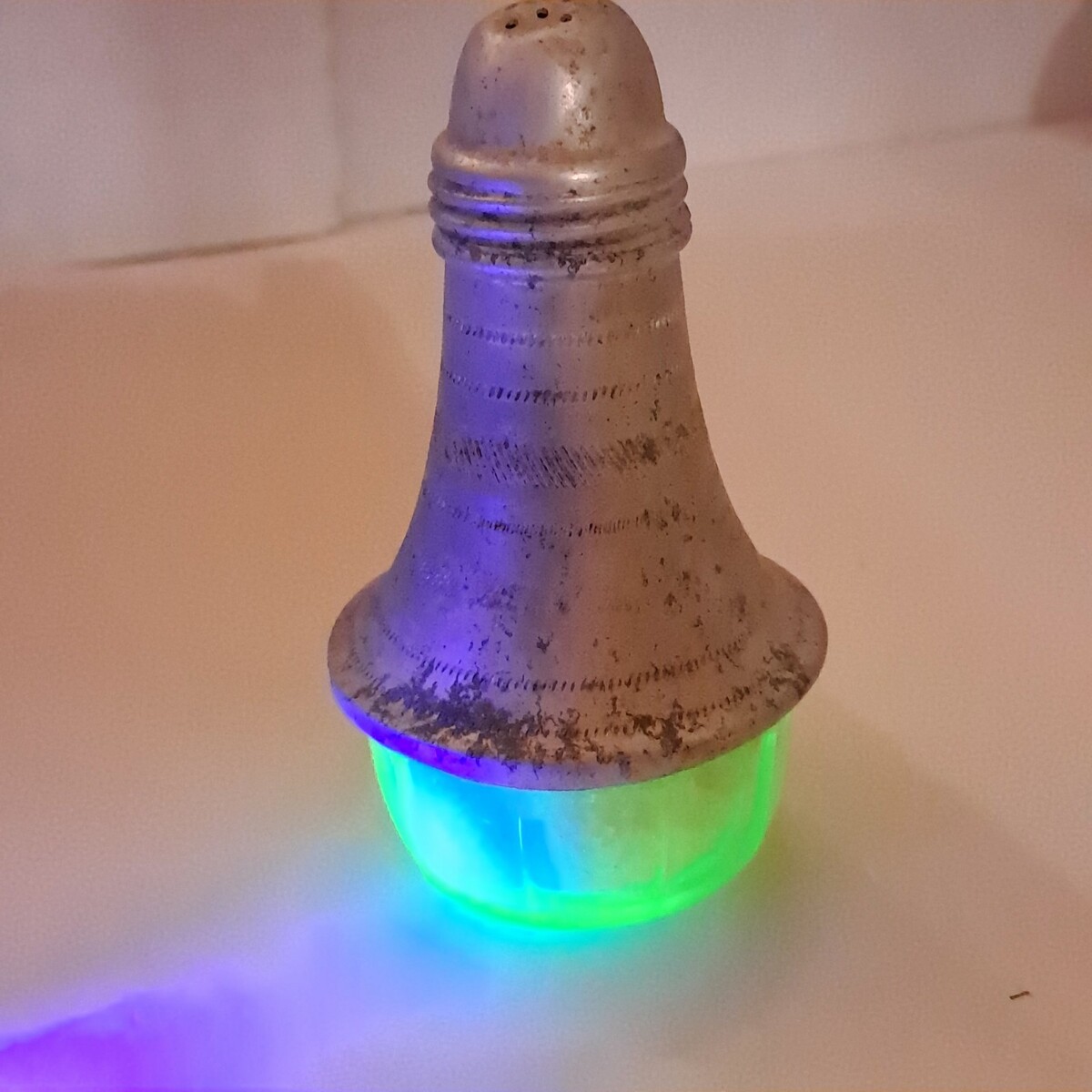 - Vintage Uranium Glass Salt Shaker Aluminum Top lid green MCM teardrop modern