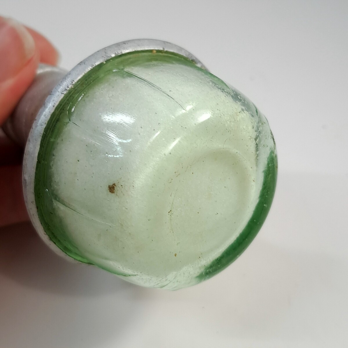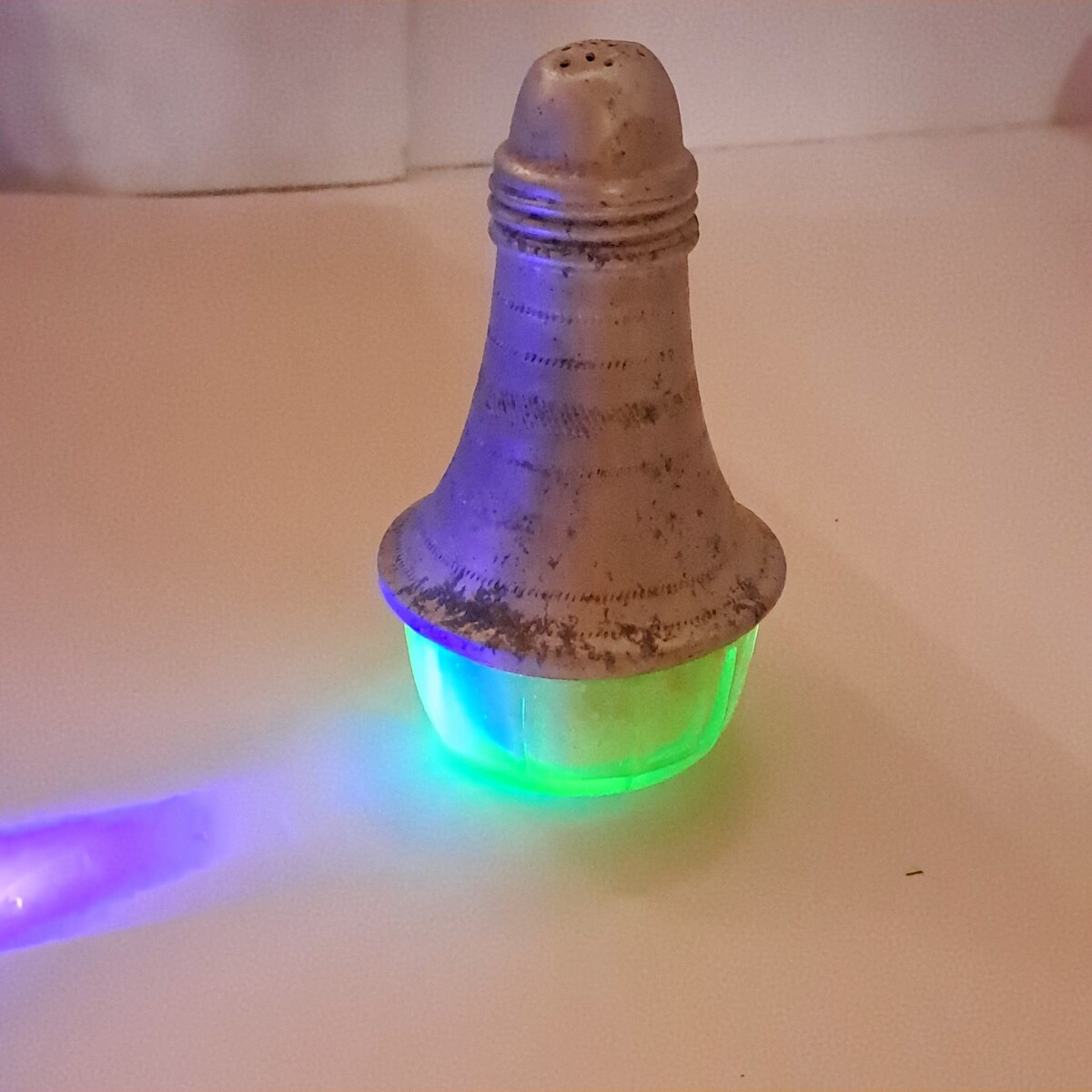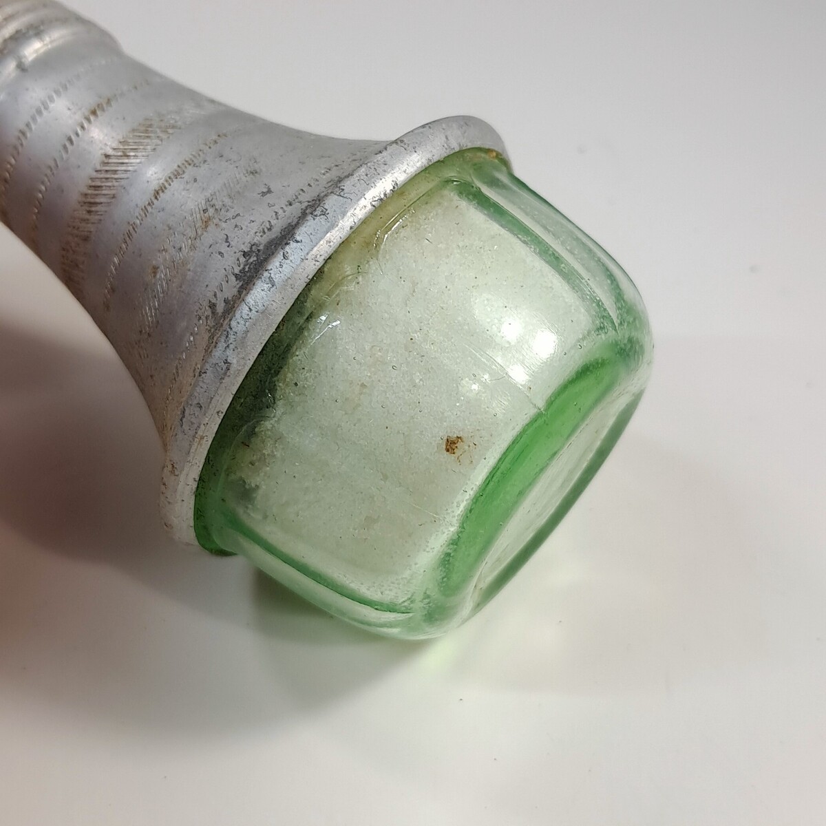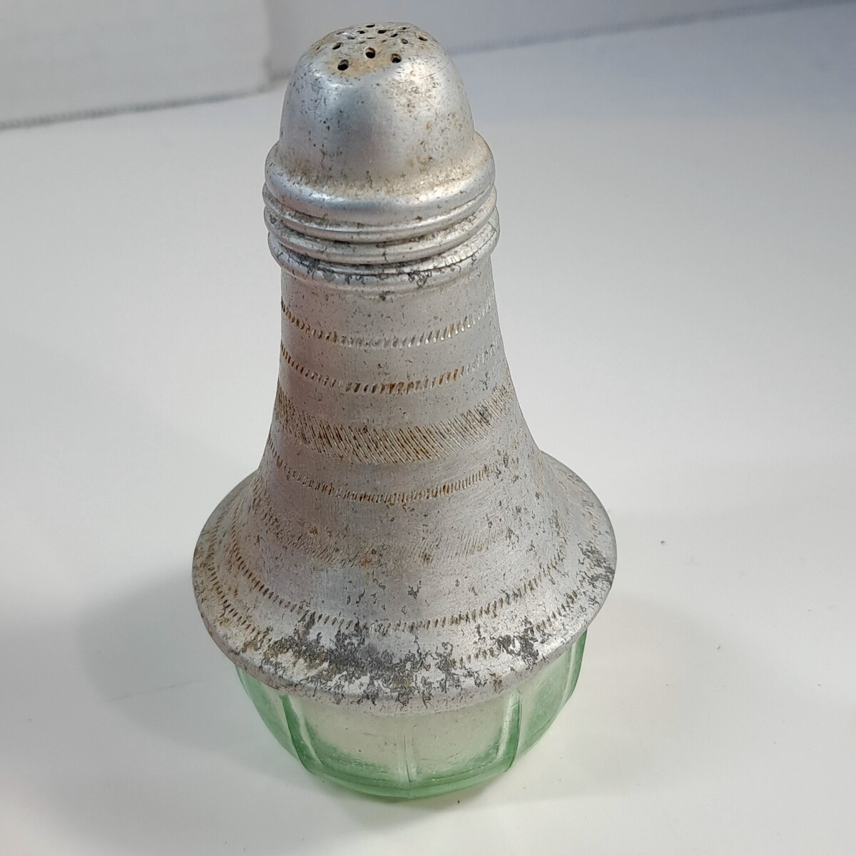 Clear green glass with aluminum top. Top has dents/patina/rust/wear as shown. I can't figure out how to get the cap off, it may be stuck. Salt is currently inside the shaker.