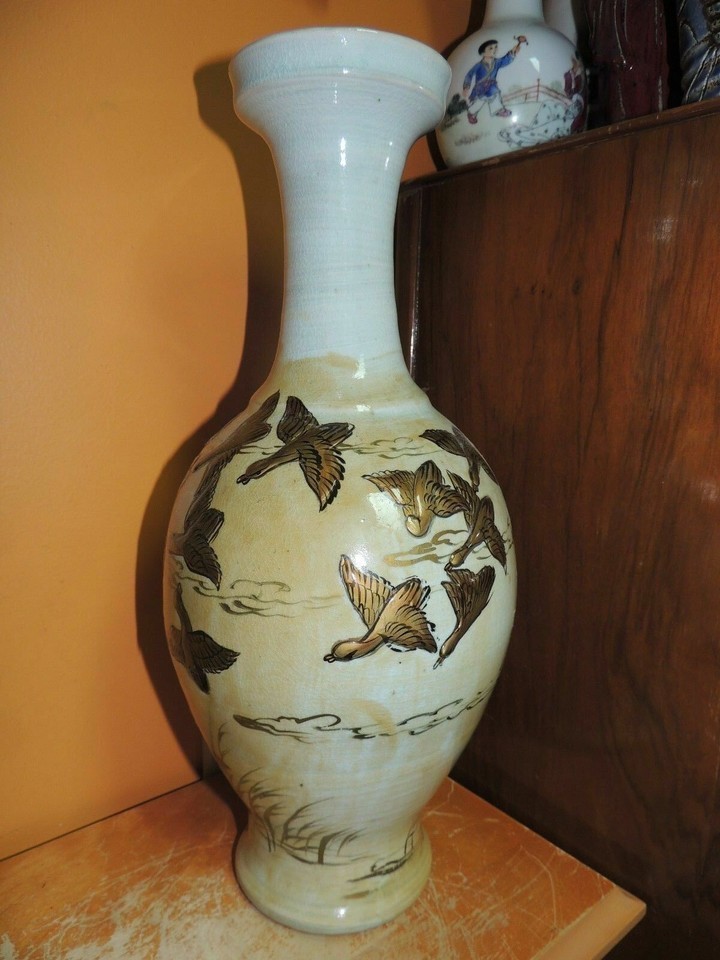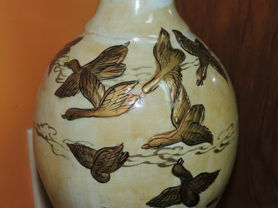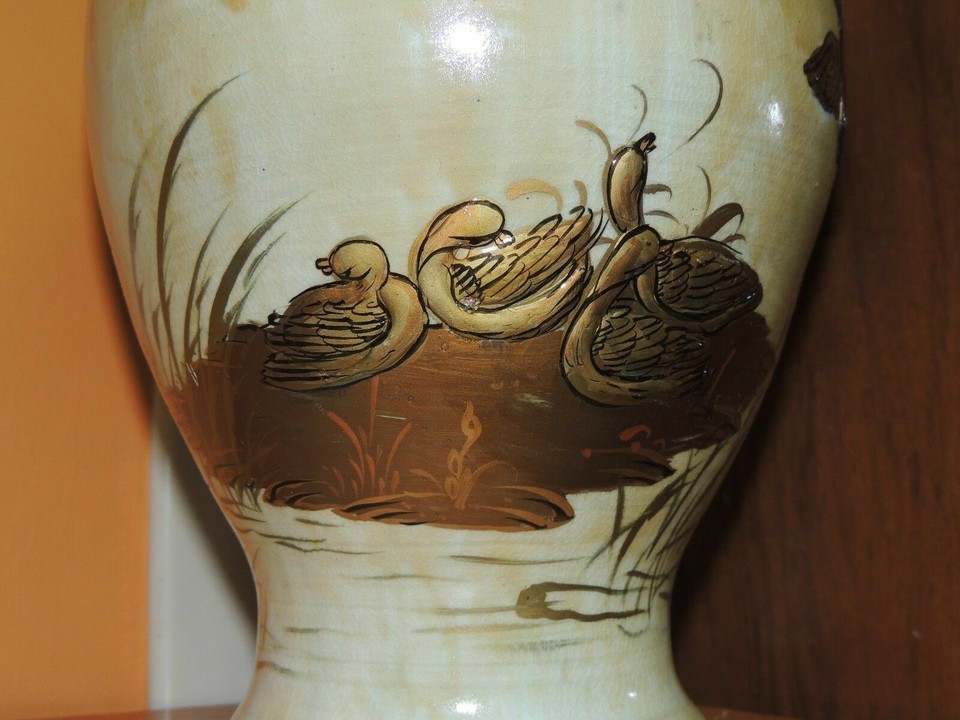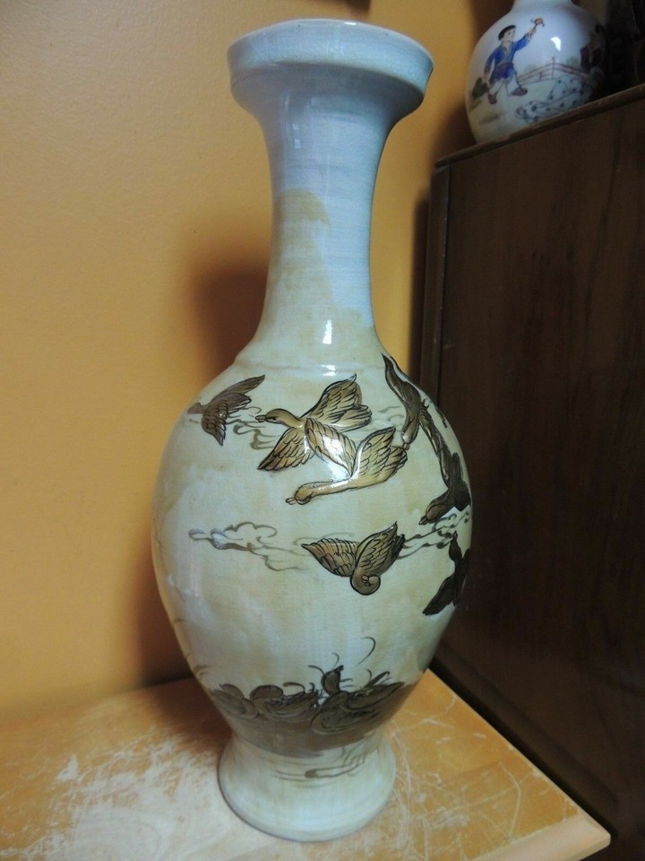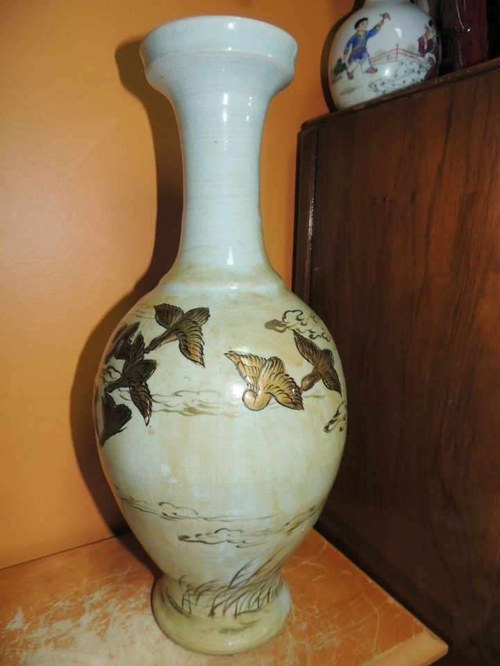 - Vintage Vase 14.5" Green Celadon raised Duck pattern painted gold washed ANTIQUE