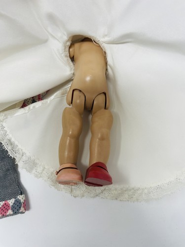 for a vintage Ginny walker doll. Move her legs and her head will move back and forth. I don't know if her arms are supposed to do anything, but they stay at her side and do not really hold poses. She comes with plenty of outfits, though the dress she has on does not have a snap. Outfits may have discoloration spots. Shoes are mismatched.