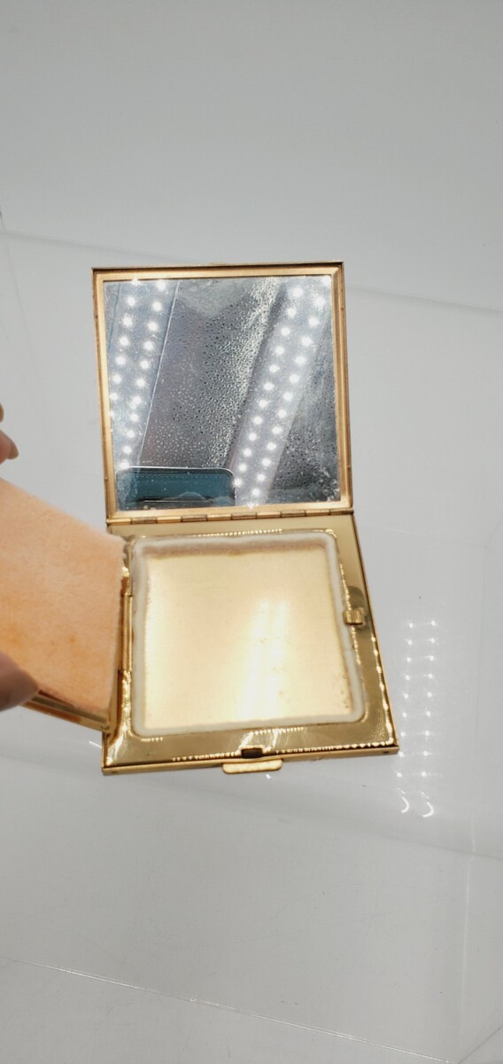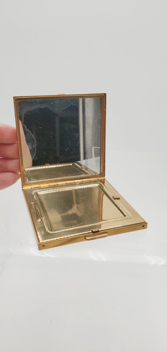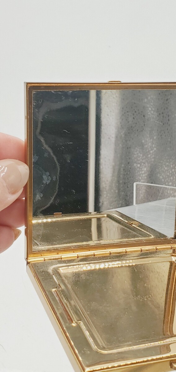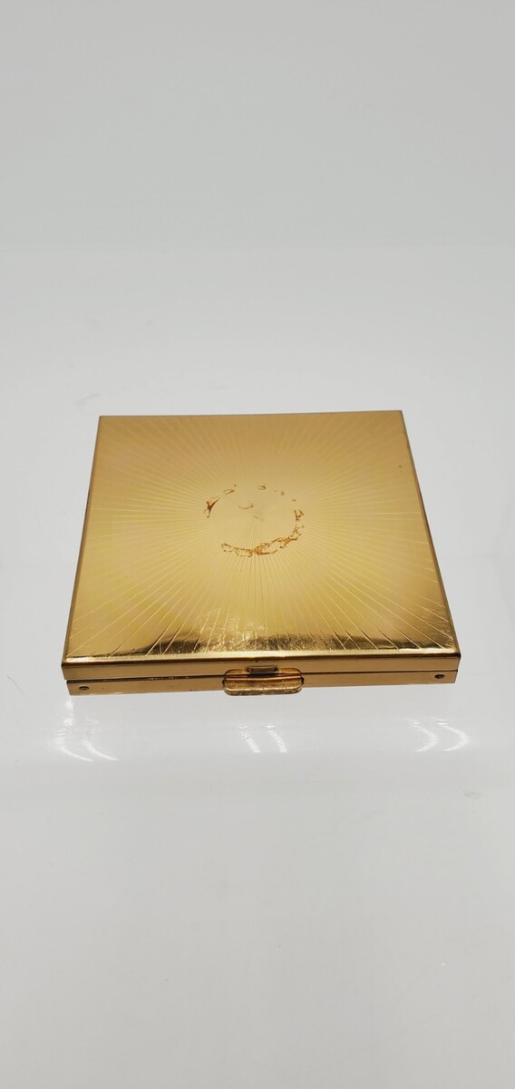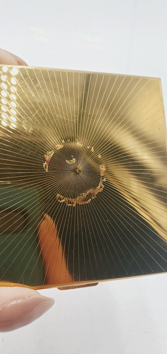 Does have dried adhesive where there was probably some rhinestones attached. Is empty, does have puff applicator included. Overall great condition except for missing decorative part. Please review photos for item details. Give me a follow as I list from estate sales for new and vintage items.