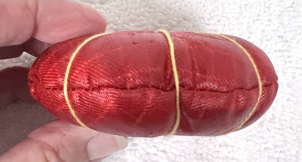 Vintage Waxed Cotton Tomato Sewing Pincushion Grid Design w Yellow 2 3/4 x 1 In in nice clean shape