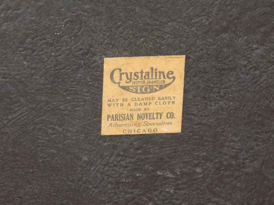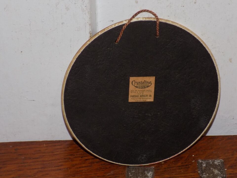 Celluloid Tin Over Cardboard Sign. It measures approx.. 6 inches across. Marked