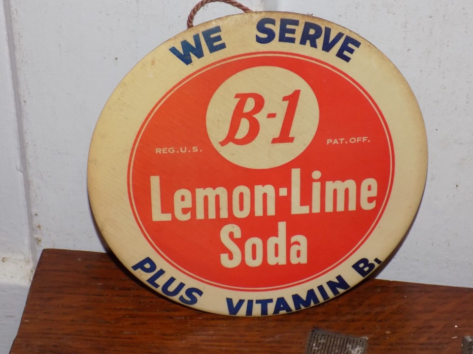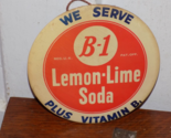 - Vintage We Serve B-1 Lemon Lime Soda Celluloid Tin Over cardboard Sign
