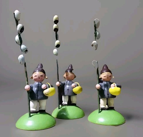 - Vintage Wendt Kuhn Erzgebirge Boys w/Pussy Willow Branch German Folk Art 3pc Lot