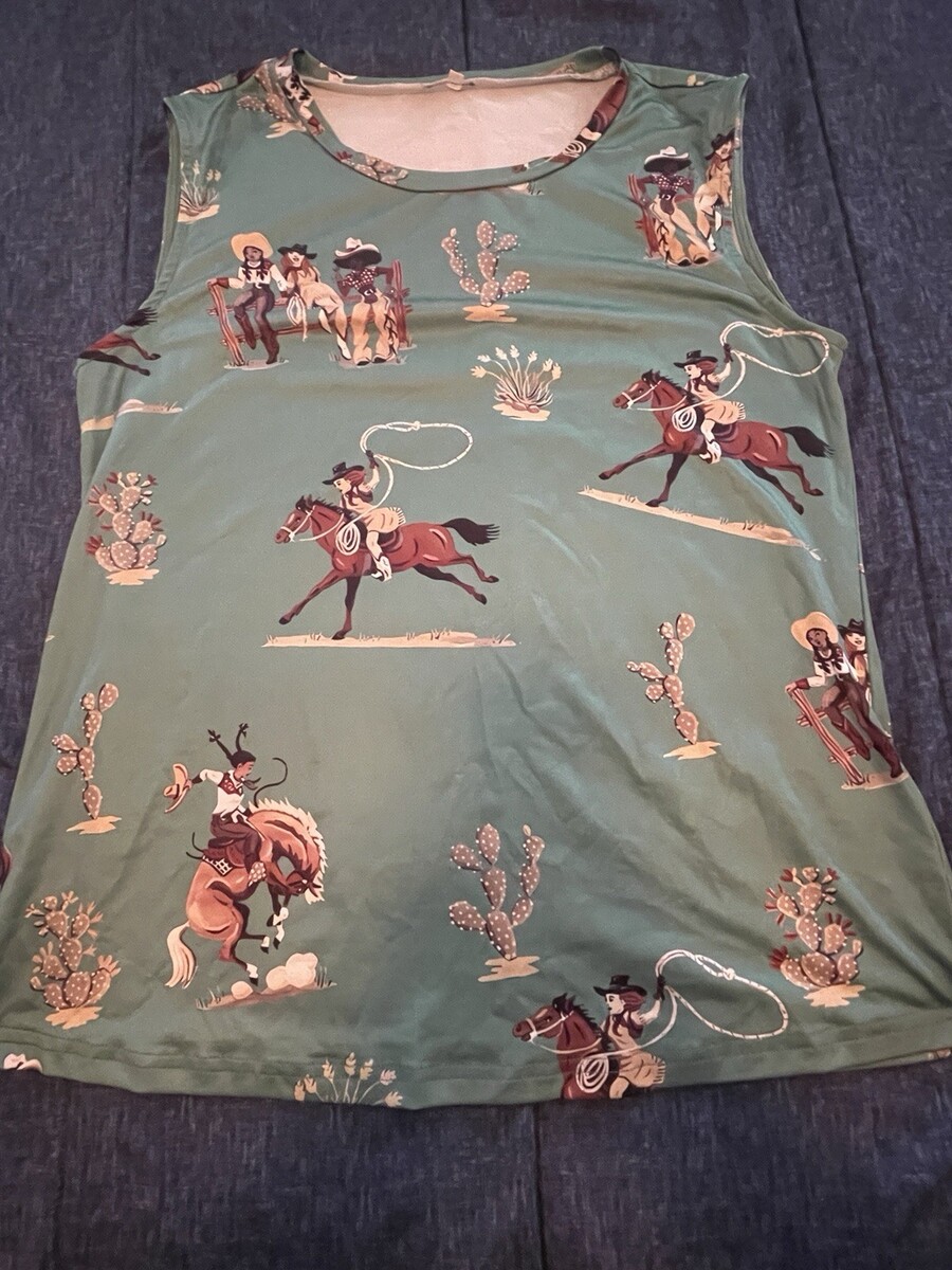 - Vintage Western-Themed Sleeveless Top With Cowboy & Horse Print Size Large