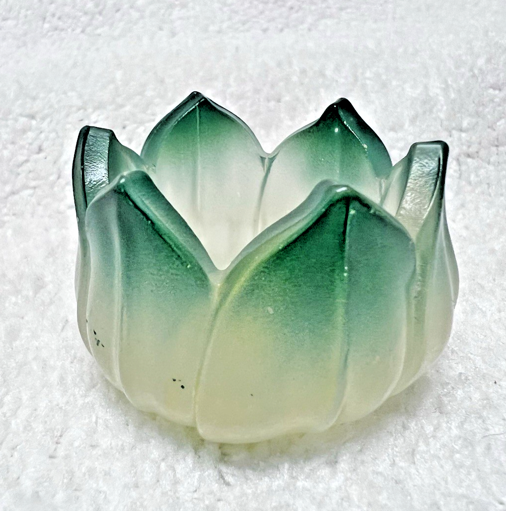 - Vintage White Green Yellow Lotus Blossom Glass Salt Dip 1 1/8 T x 1.5 W