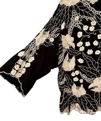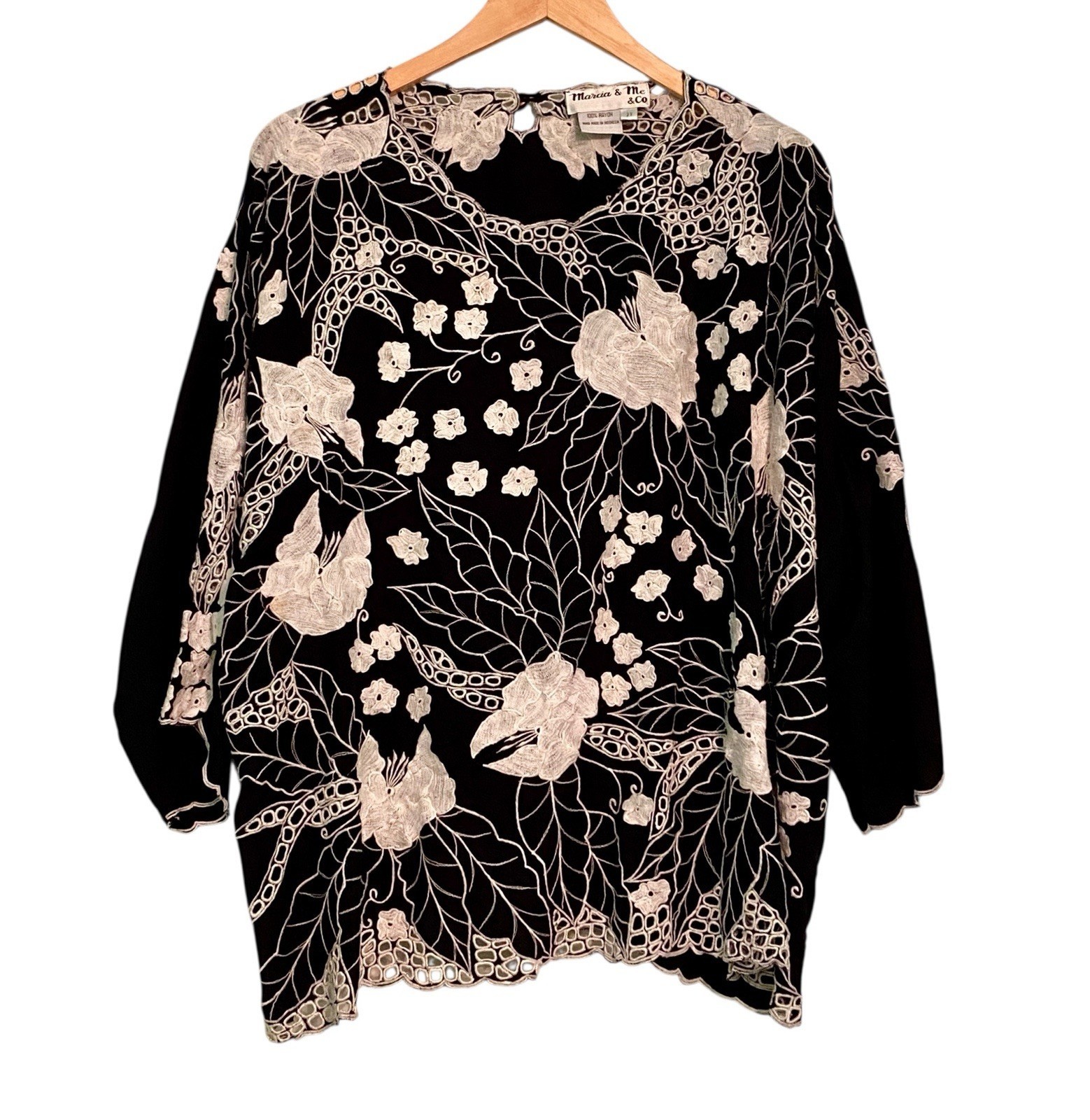 - Vintage Womens Blouse Size 3X Black White Cutwork Rayon 3/4 Sleeves Stain