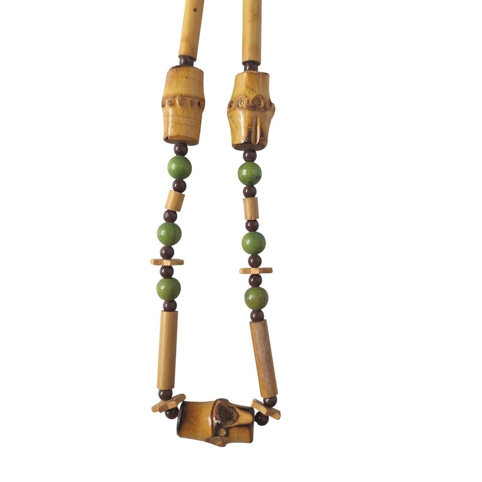 - Vintage Wood Green Seed Beaded Necklace Bamboo Barrel Beads Natural Hippie Boho