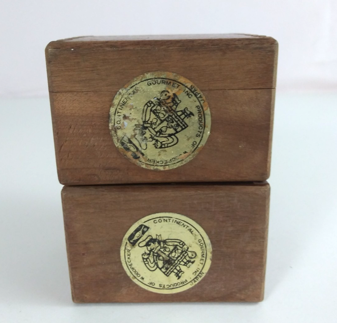 This is for a Vintage Woodpecker Continental Gourmet Wooden Salt Pepper Shakers Japan.