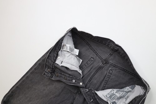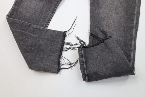 Cuffs frayed/loose threads. Thread bare pockets. Dark spots, discolored. Distressed and faded. Color faded. Has a button fly. Blemish back left