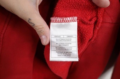Holes cuffs. Stains/dark spots throughout. Design distressed, graphics faded. Hood, cuffs discolored. Color faded. Pilling