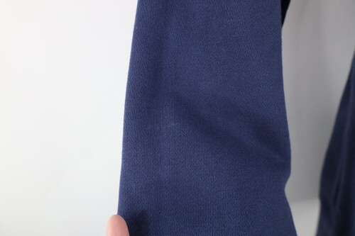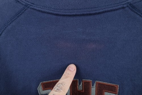 Bleach stains back top. Blemishes front, back, shoulders, collar. Collar, cuffs discolored. Color faded. Pilling. Loose threads left side