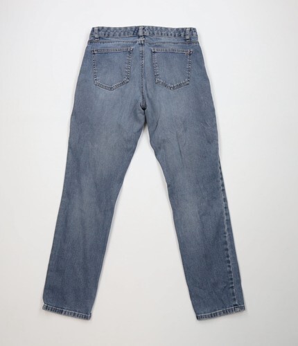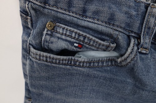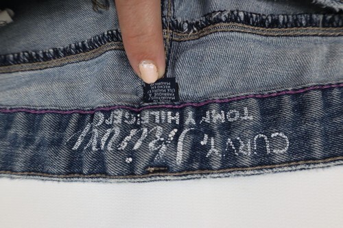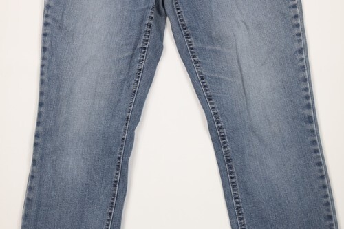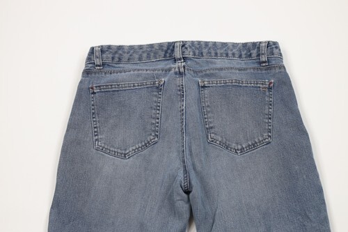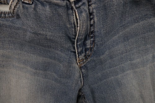Thread bare waist, fly, cuffs, pockets. Loose threads pockets. Threadbare spots on sides. Discolored, distressed and faded