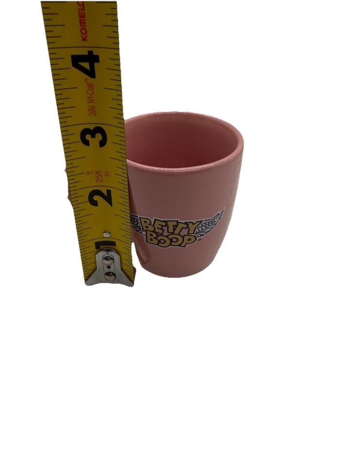 The product is a vintage collectible mini coffee cup featuring Betty Boop, a well-known animation character. Please note size and see photos for detailed views and size
